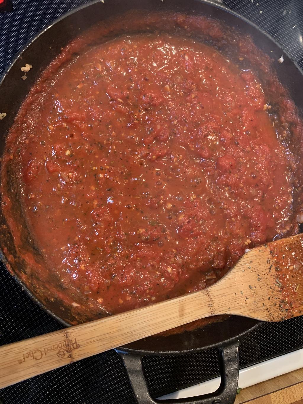 Step #10 Allow the tomato sauce to reach a simmer, then reduce heat to low. Use spatula to combine all the ingredients. Cook tomatoes until they break down, about 30 to 60 minutes.