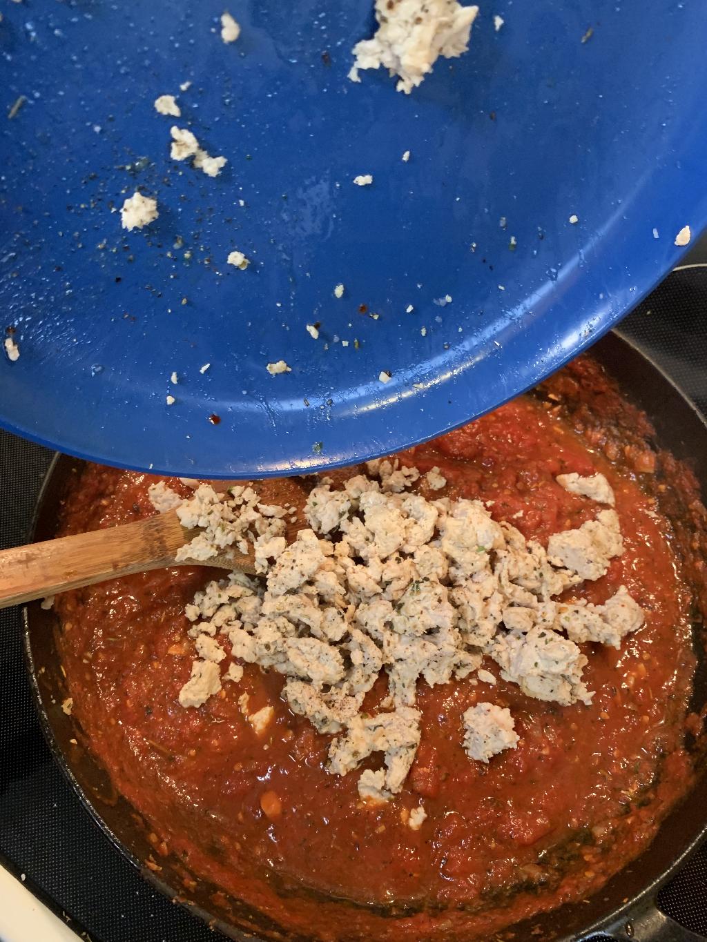 Step #11 Divide the ground pheasant in half, adding half to the tomato sauce and the other half to a mixing bowl.