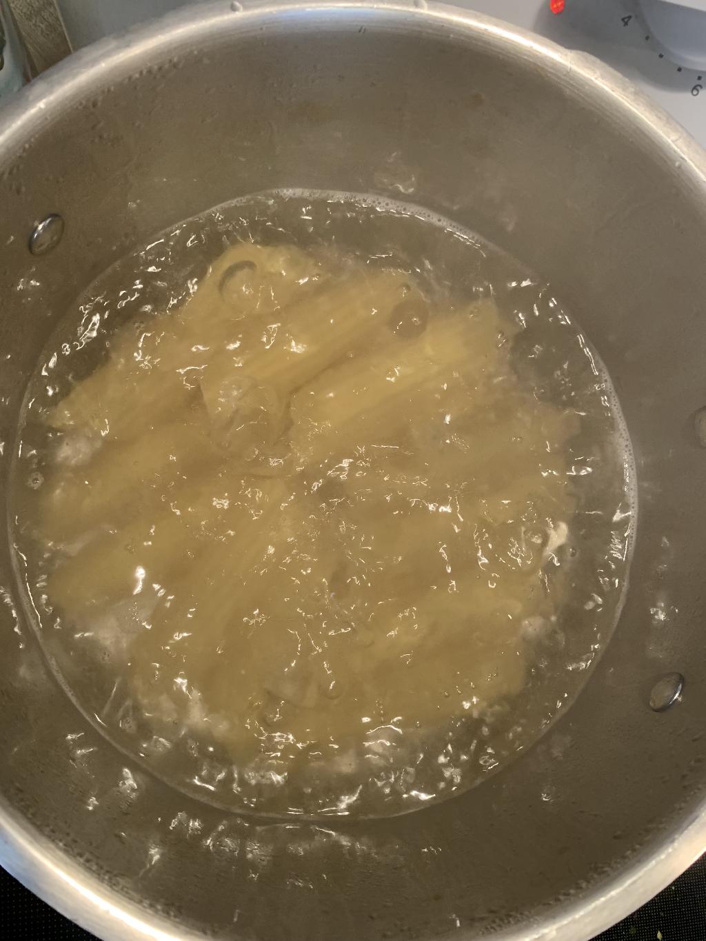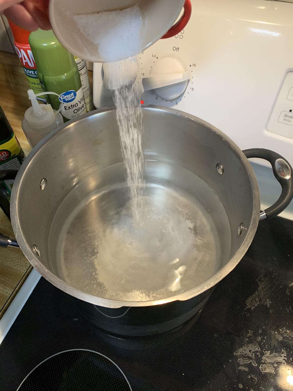 Step #12 Add about 8 cups of water to large stock pot, with heat set to high. When water reaches a boil, add a couple handfuls of salt.
