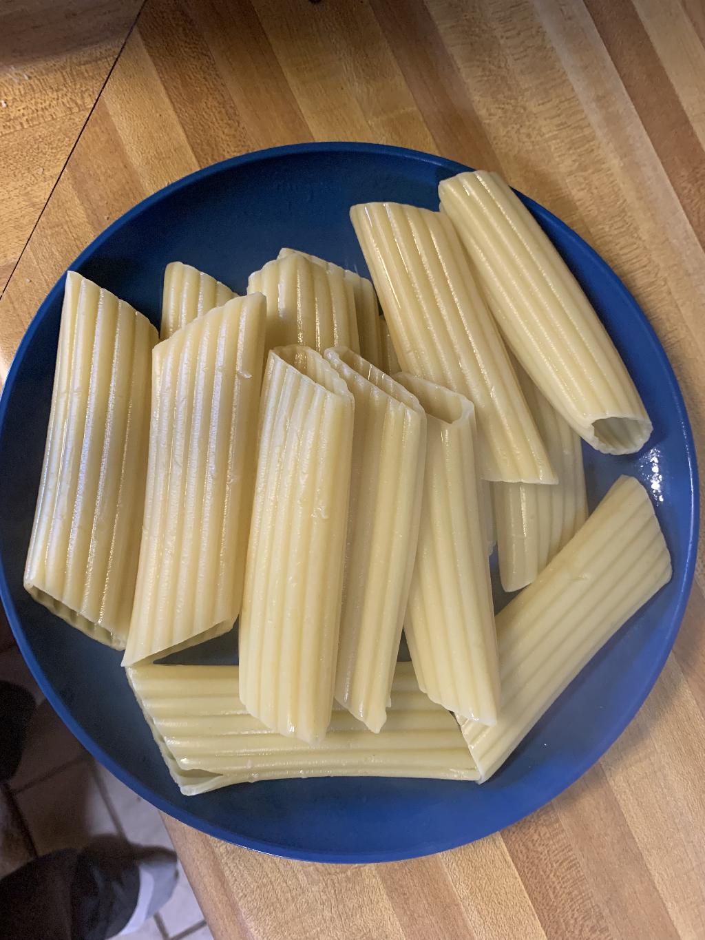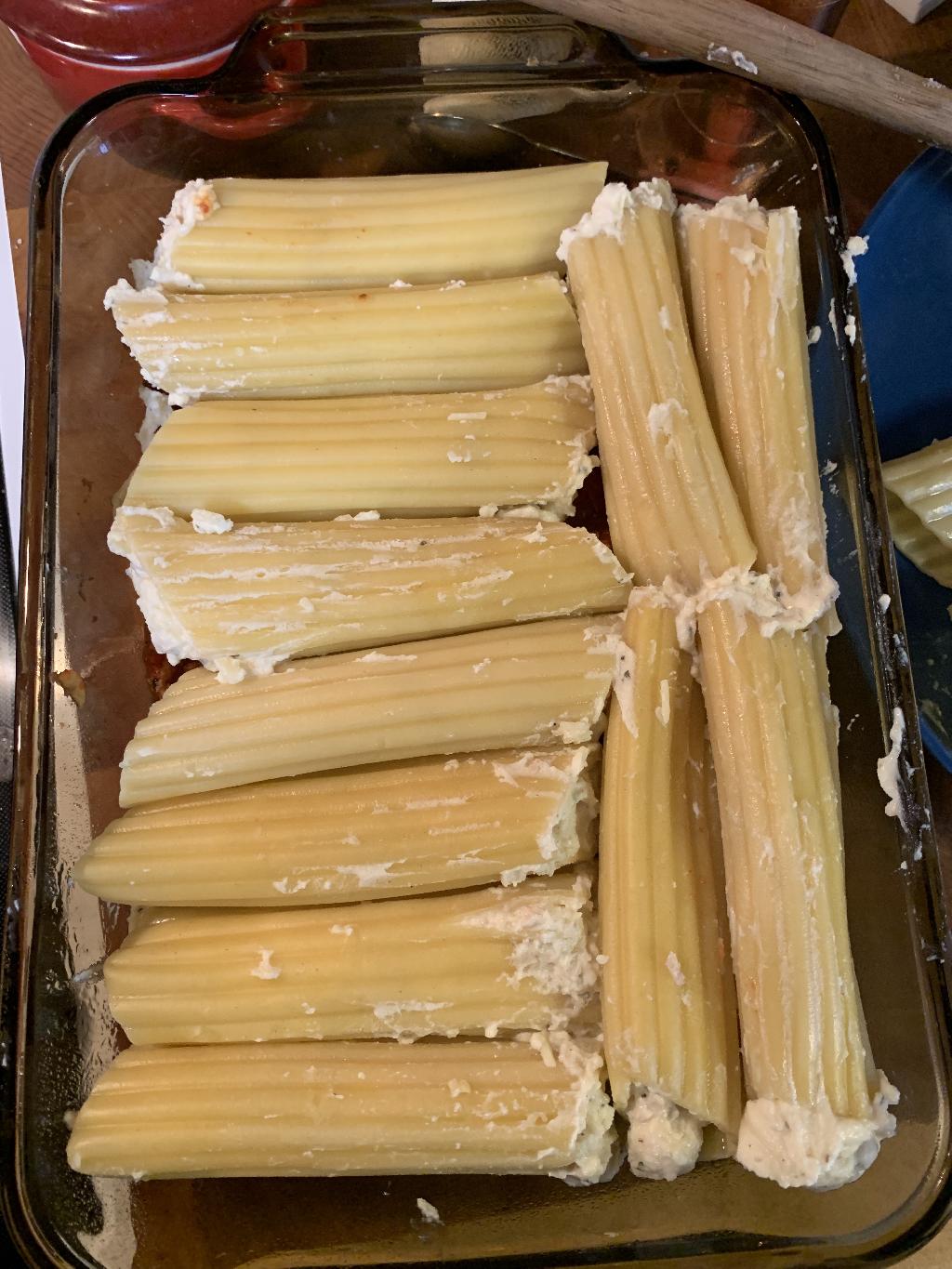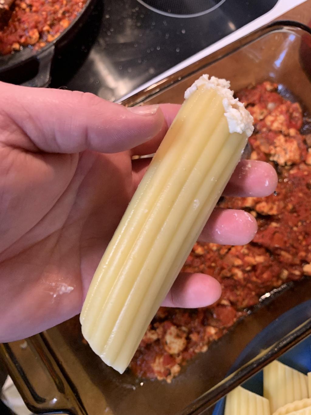 Step #20 Add filling to a piping bag or zip lock bag with one of the corners cut out. Use your bag of filling to fill the Manicotti noodles.