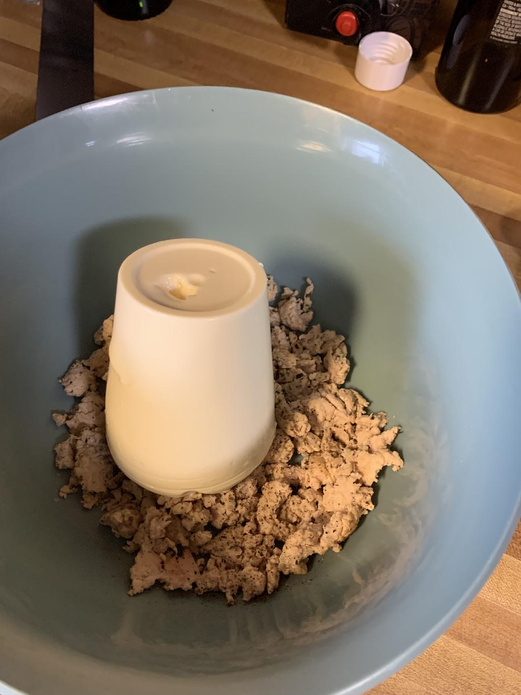Step #15 Next let's work on our filling. Add Ricotta to the mixing bowl with ground pheasant.