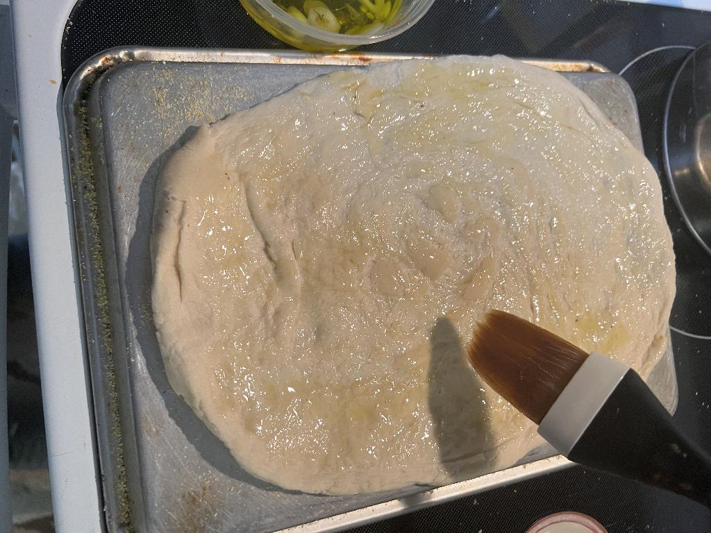 Step #7 Brush pizza crust with garlic infused Olive Oil