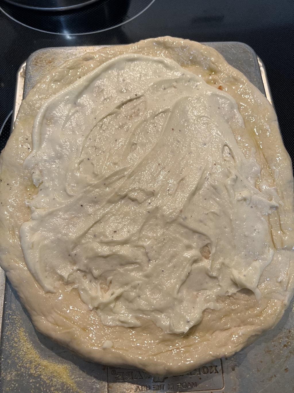 Step #8 Spoon on some of the Béchamel Sauce, spreading sauce with spatula, then sprinkle with cayenne pepper.