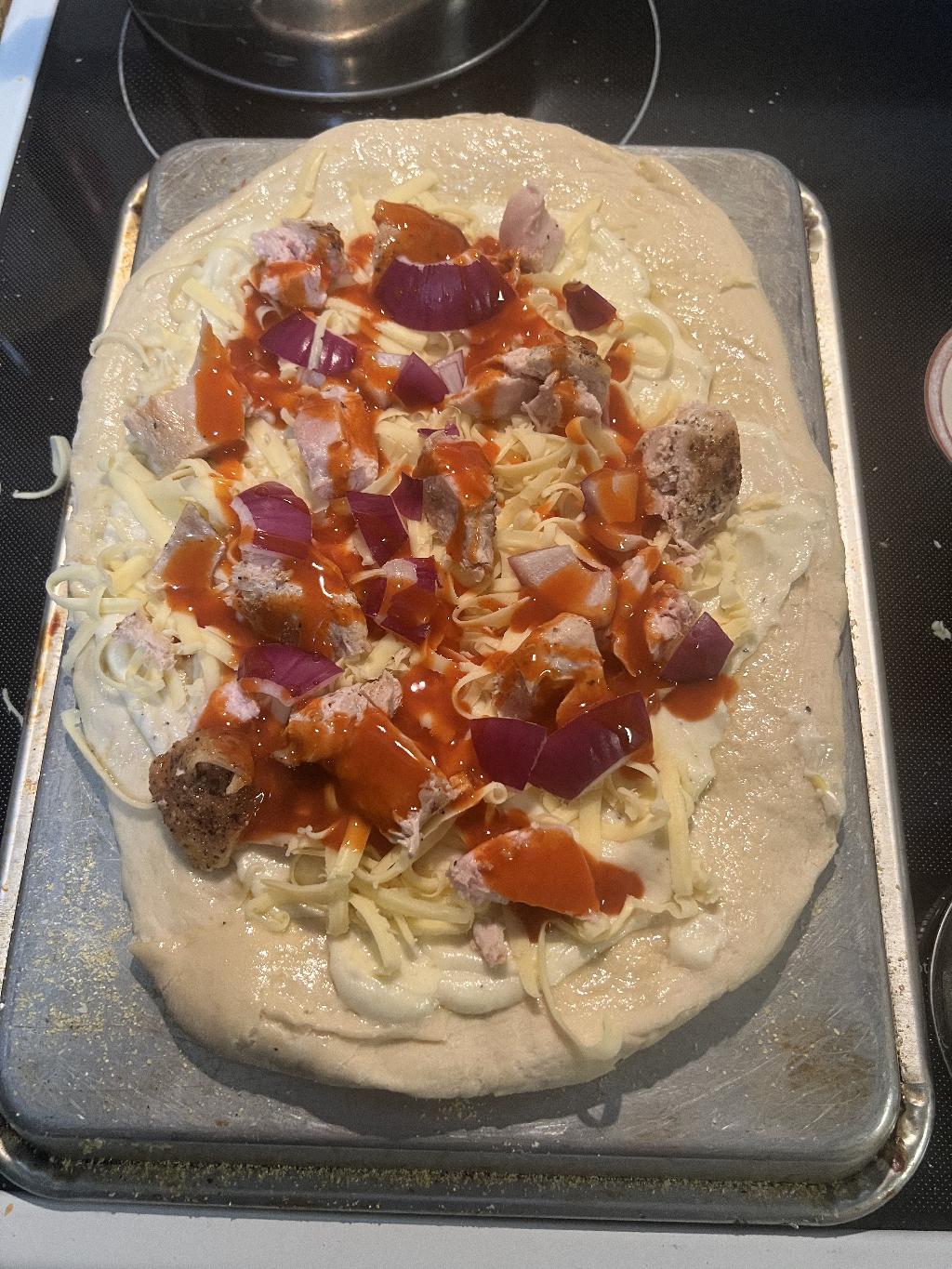 On this Buffalo pizza I'm substituting the traditional tomato-based pizza sauce with a white bechamel sauce. Layering on the cheese, then drizzling with Buffalo sauce. I love Buffalo sauce and was tempted to use it as my pizza sauce but was afraid it'd be too overpowering for the wife and kids if they decided to sample mine. I also could have mixed it with my Bechamel sauce to tame it down a little and give the white sauce a more traditional reddish pizza sauce color, but instead decided to just drizzle the sauce over top of the finished pizza.