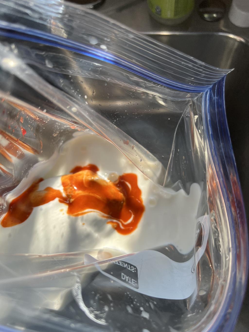Step #1 Place birds in a zip lock bag and cover with buttermilk. Add a few dashes of hot sauce, seal the bag and shake back and forth to combine. Add zip lock bag to the refrigerator for 4-6 hours to brine.