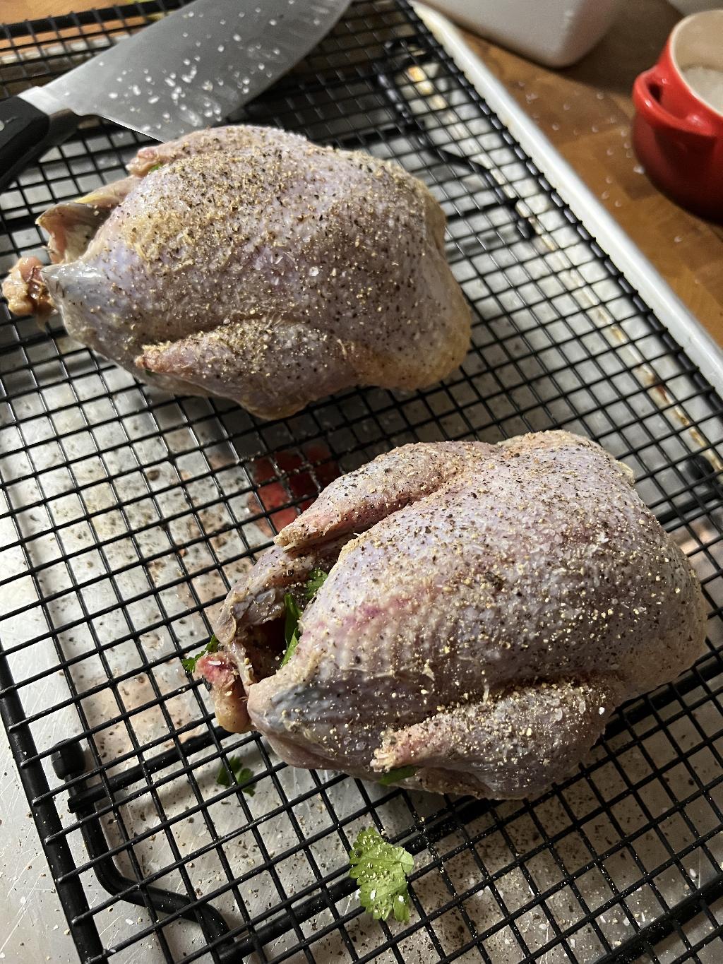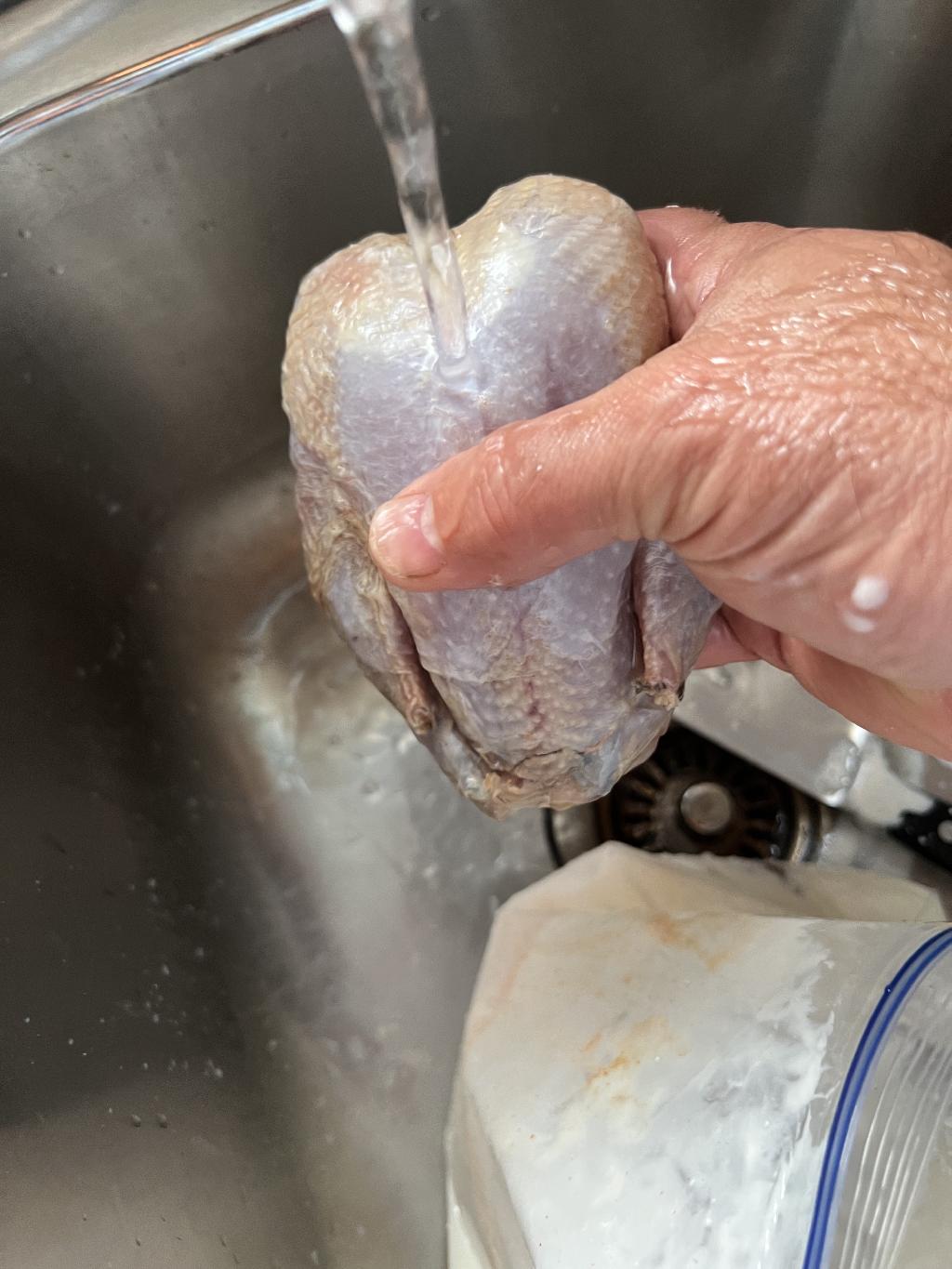 Step #2 Remove bird from brine and give a quick rinse. Place on a wire rack to air dry. Preheat oven to 450 degrees.