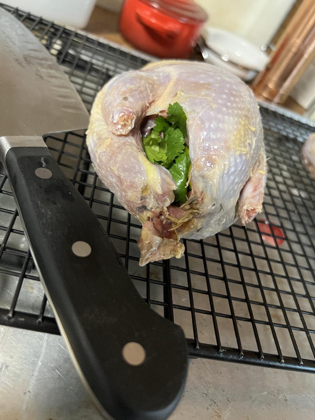 Step #3 Stuff the cavity of the birds with slices of lime and cilantro.