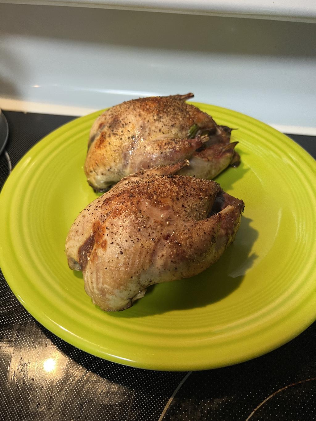 Step #5 Add 1 1/2 tablespoon of butter to an oven proof skillet. Set heat to medium high and allow to get hot. Add the birds to the hot skillet allow to cook for two minutes. Remove skillet from stove hot and place in hot oven for 15 to 20 minutes or the internal temperature reach 155 degrees.