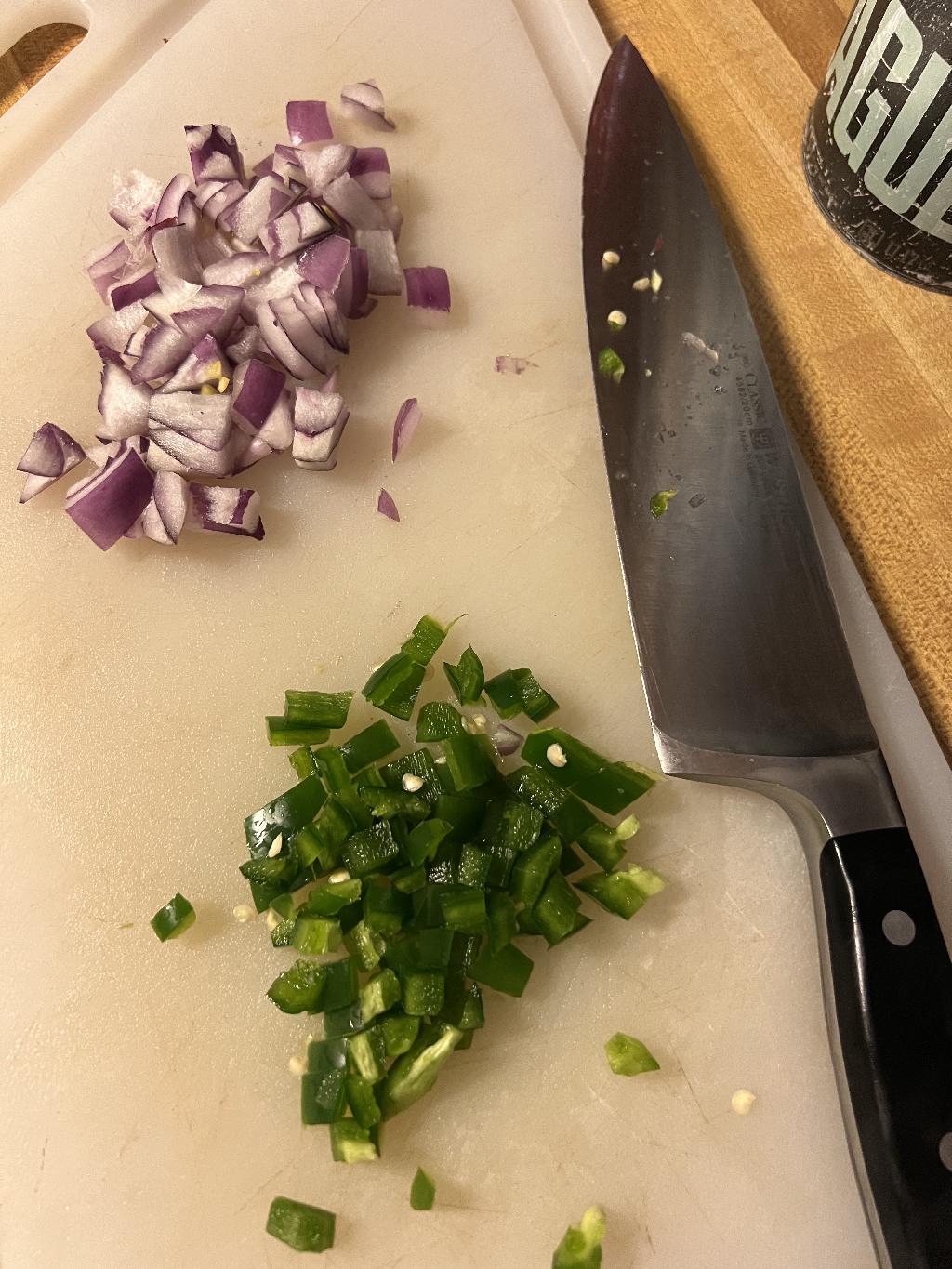 Step #10 Dice Jalapeno and Red Onions. Shred cheese if you bought it in a block.