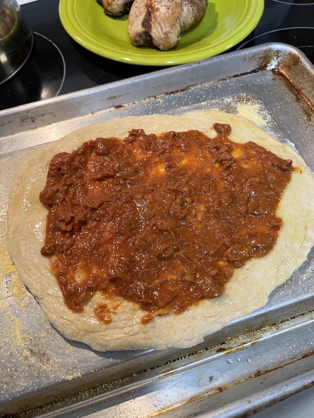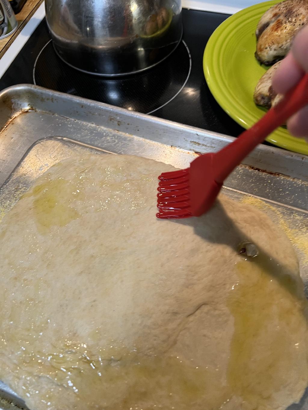Step #13 Brush the pizza dough all over with the Garlic Infused Olive Oil
