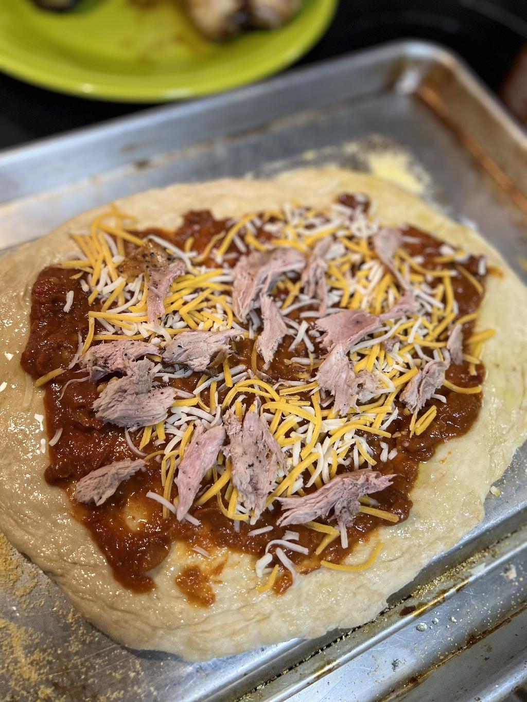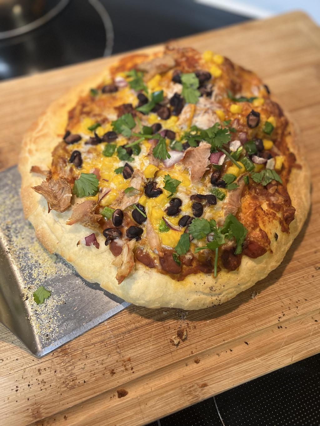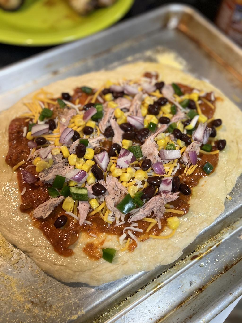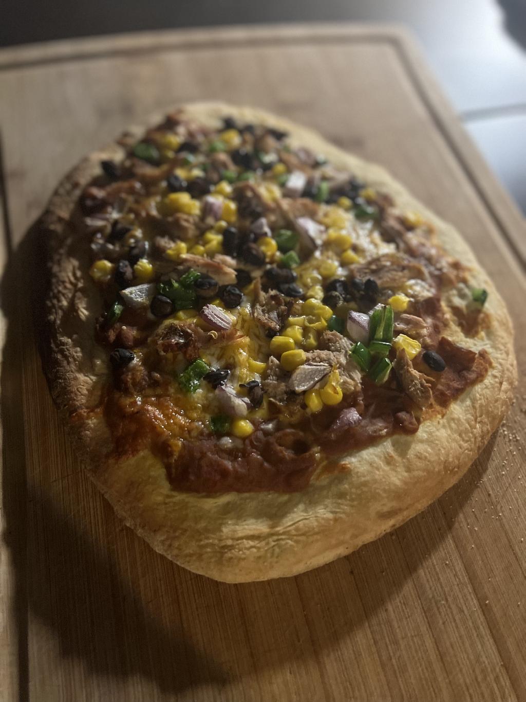 Go back to all recipesThis is pizza number three of my summer pizza blowout. I'm calling it a Southwestern Chukar Pizza; it's loaded with Black Beans, Corn, Jalapeno, Red Onions, and Roasted Chukar. Instead of a traditional pizza sauce, I'm using a spicy little bean dip. The recipe I'm including is for doing one 12-inch pizza, with a thick crust. You could roll this dough out thinner if you wanted to do a larger, thin crust pizza, but our pizza oven is only big enough for these small pizzas.