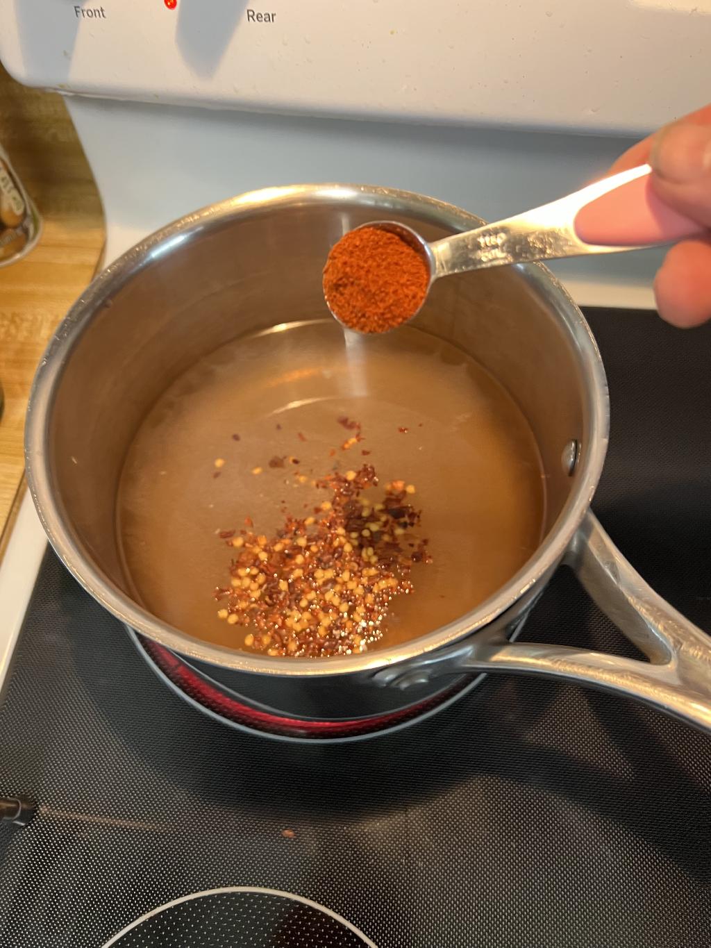 Step #1 Add water, vinegar, spicy maple syrup, salt, cayenne and red pepper flakes to a small sauce pan and bring to a boil. Boil for heat minute then turn off heat.