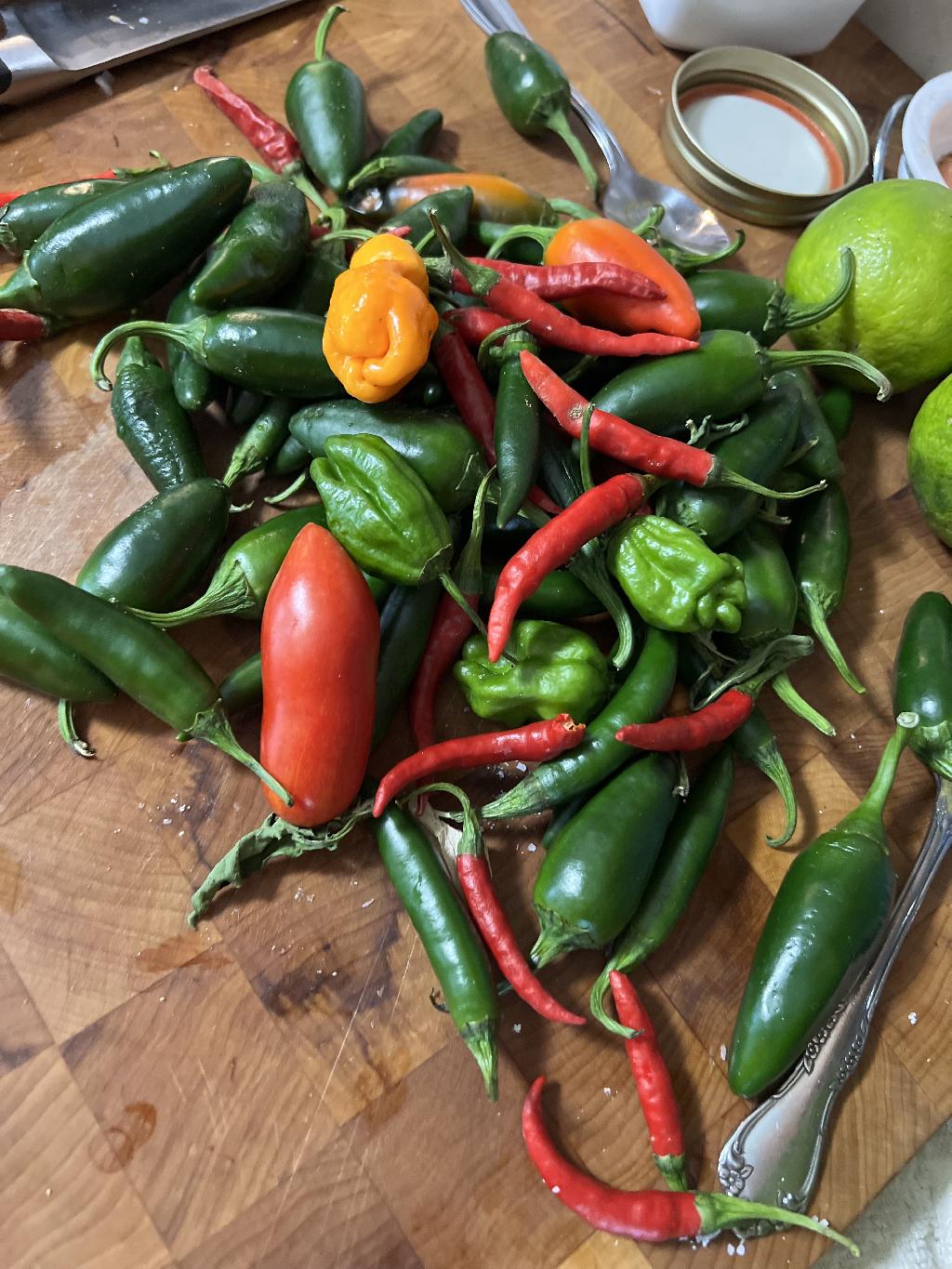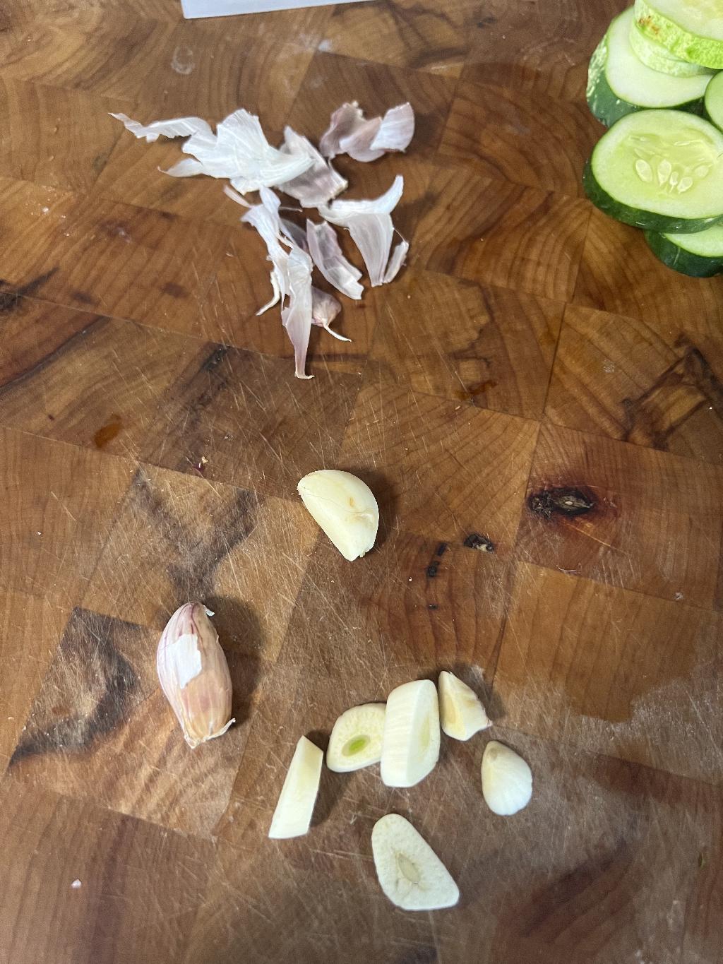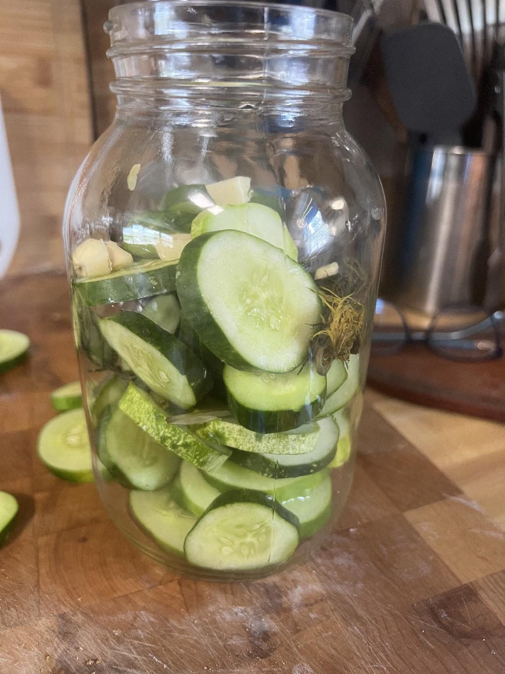 Step #6 Add cucumber slices, sliced garlic, whole hot peppers and dill to mason jars.