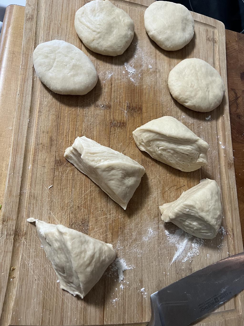 Step #9 Take your cut pieces of dough and form them into round shape, then place on parchment paper lined baking sheet. I form these pieces into balls by pinching the edges underneath, then press flat.