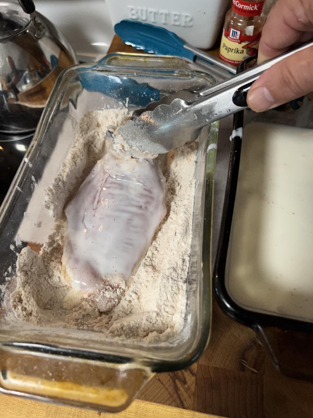 • For a better crust, dredge in flour first, shaking off any excess, then wet dredge, then dry dredge.