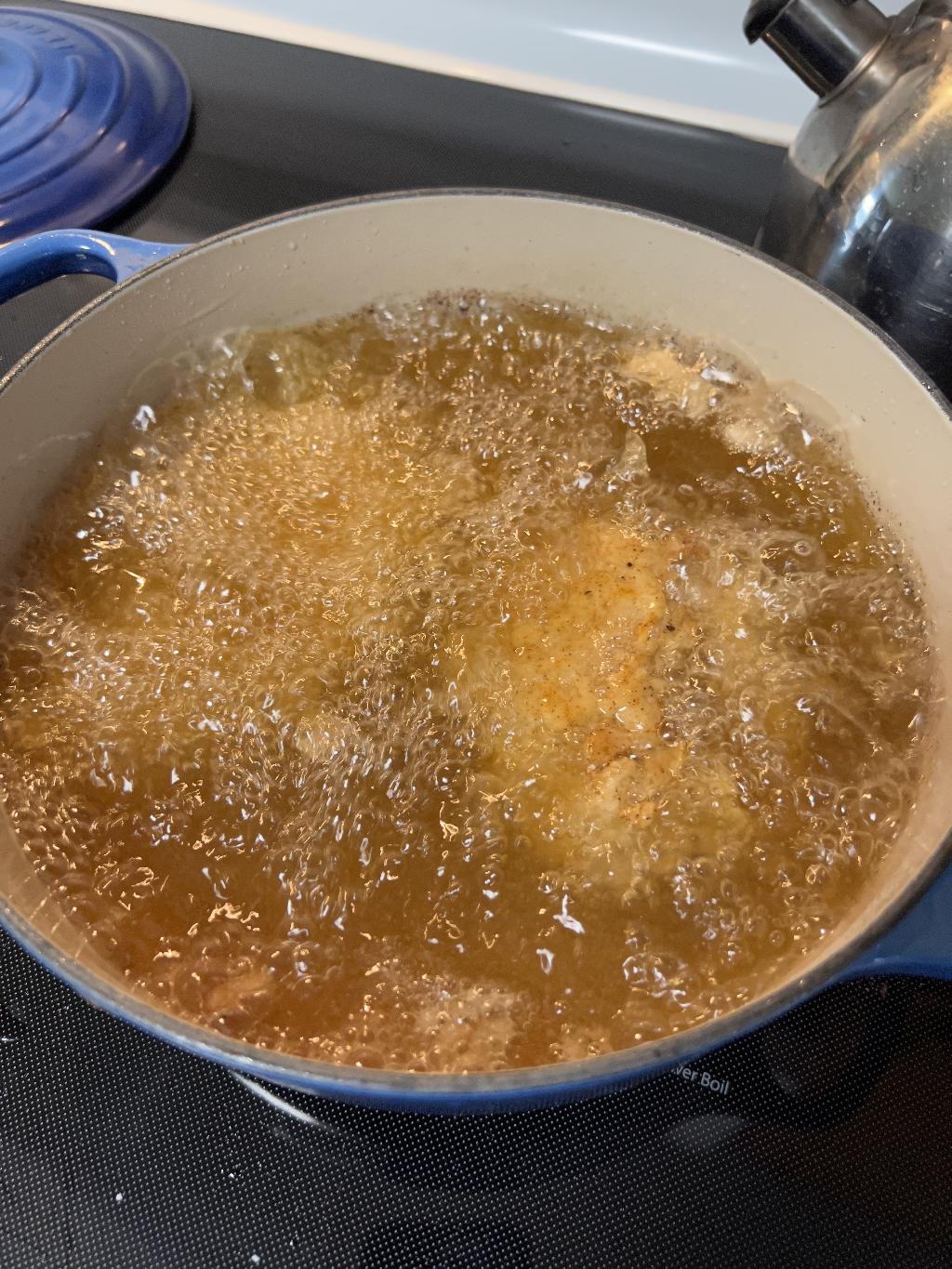 • Use peanut or canola oil and allow it to reach a steady 350 degrees before starting to fry.