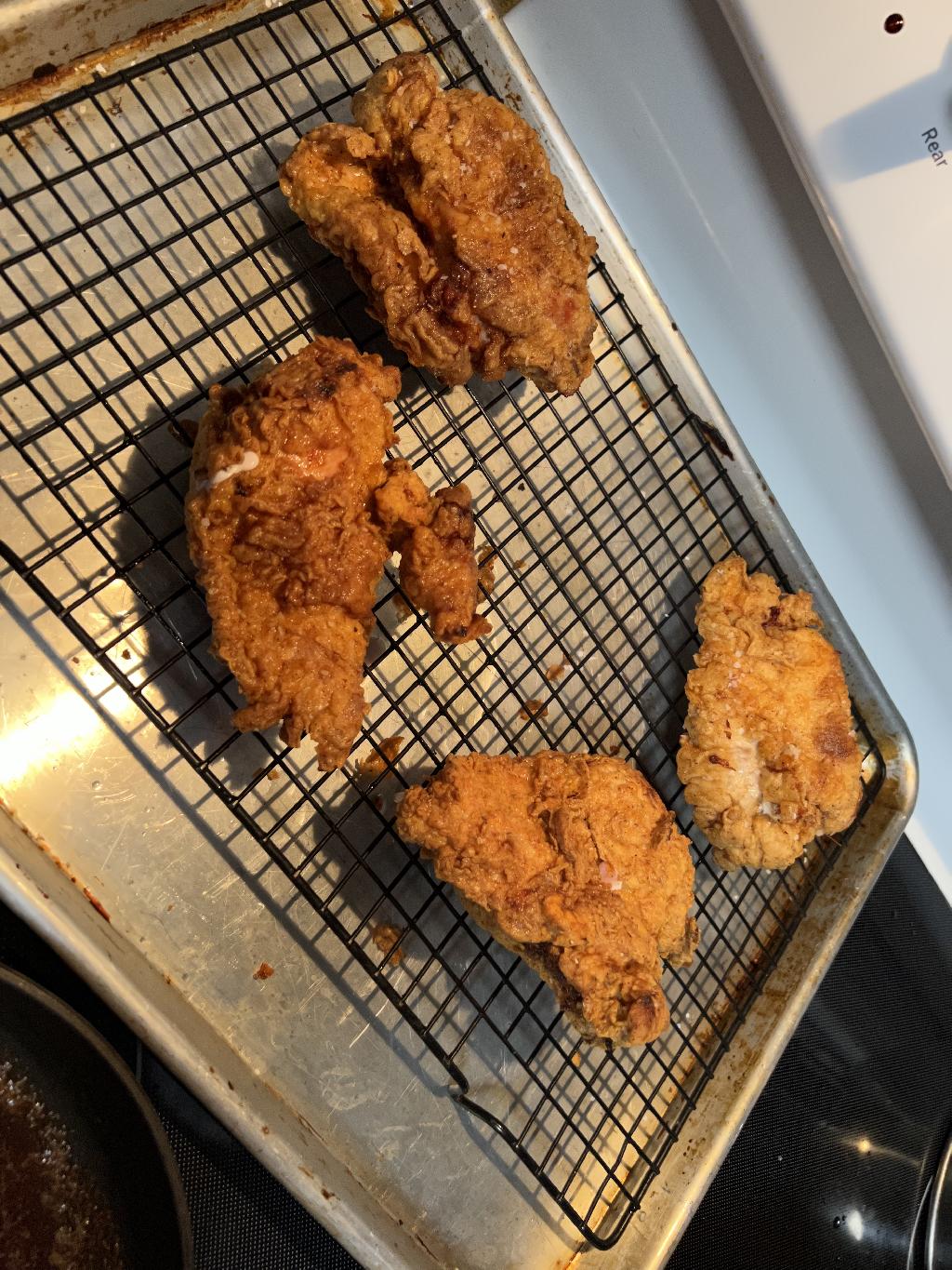 • Add some type of spirits to your brine and wet dredge mixture, like vodka, bourbon, or whiskey. The alcohol being more volatile than water when it hits the hot grease will help create a nice crust.