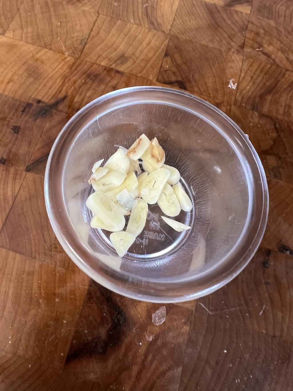 Step #8 Once all the skins are removed, dice up yellow onion and garlic.