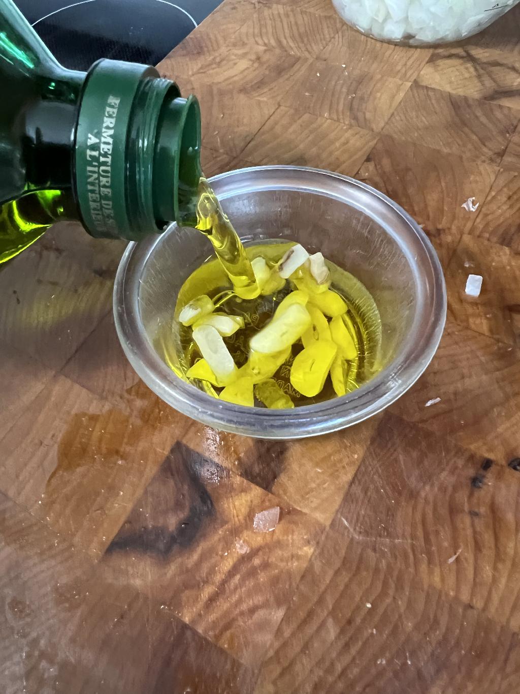 Step #2 Drizzle in Olive Oil and allow two sit for 30 to 40 minutes.