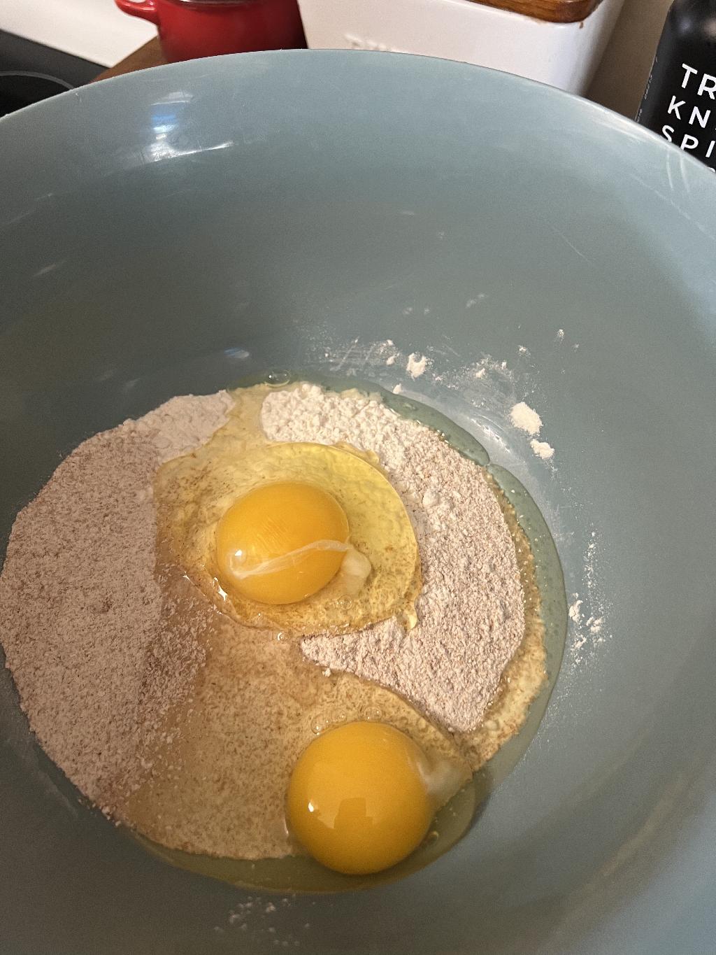 Step #3 Using your hands or a spatula combine the eggs and flour.