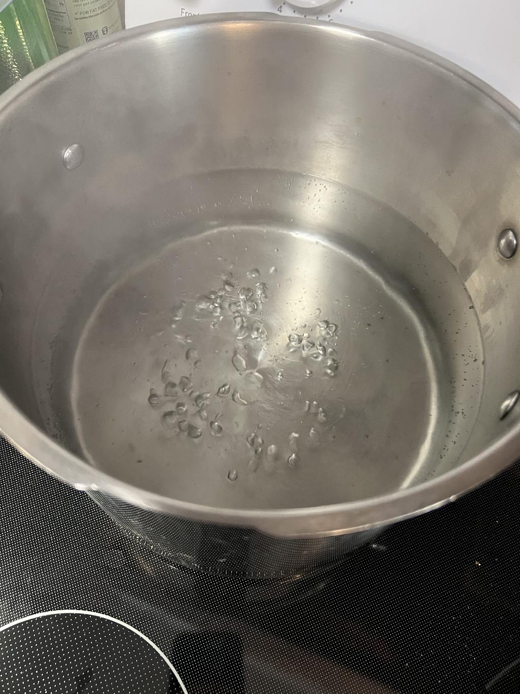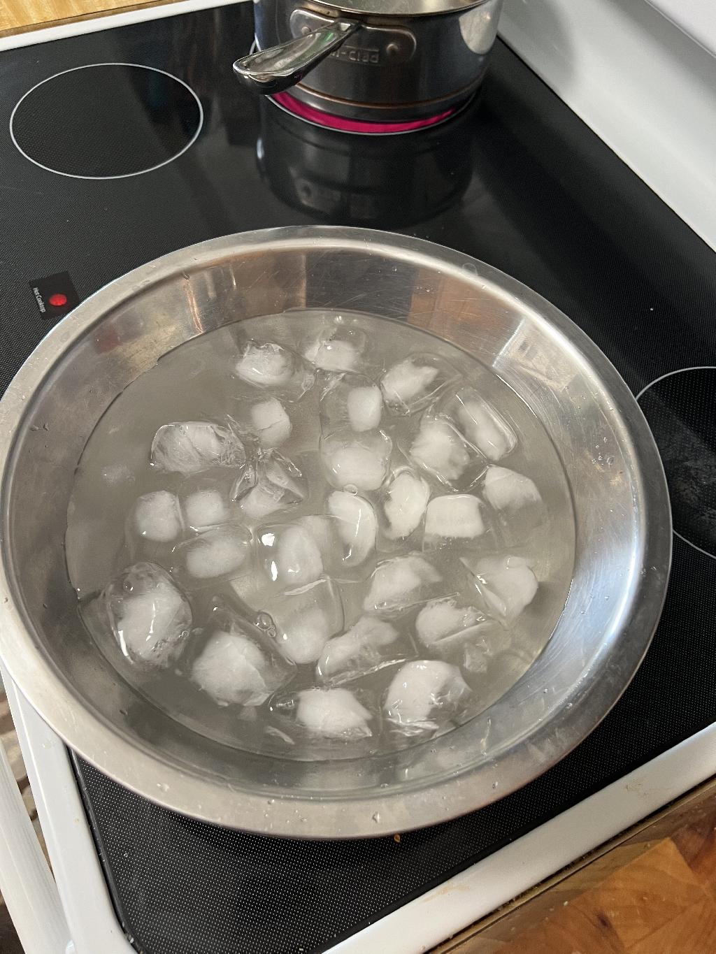Step #2 Set a pot on the stove and fill it half way up with water. Turn the heat on high and let it reach a rolling boil. Fill another mixing bowl with water and a bunch of ice cubes.