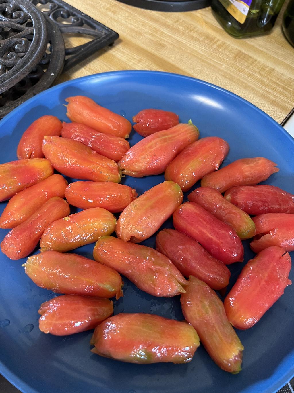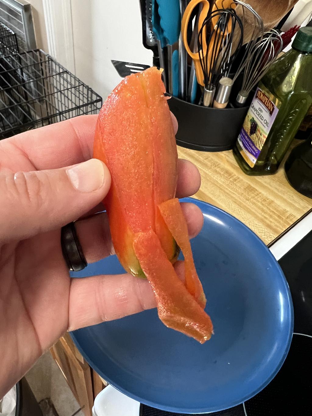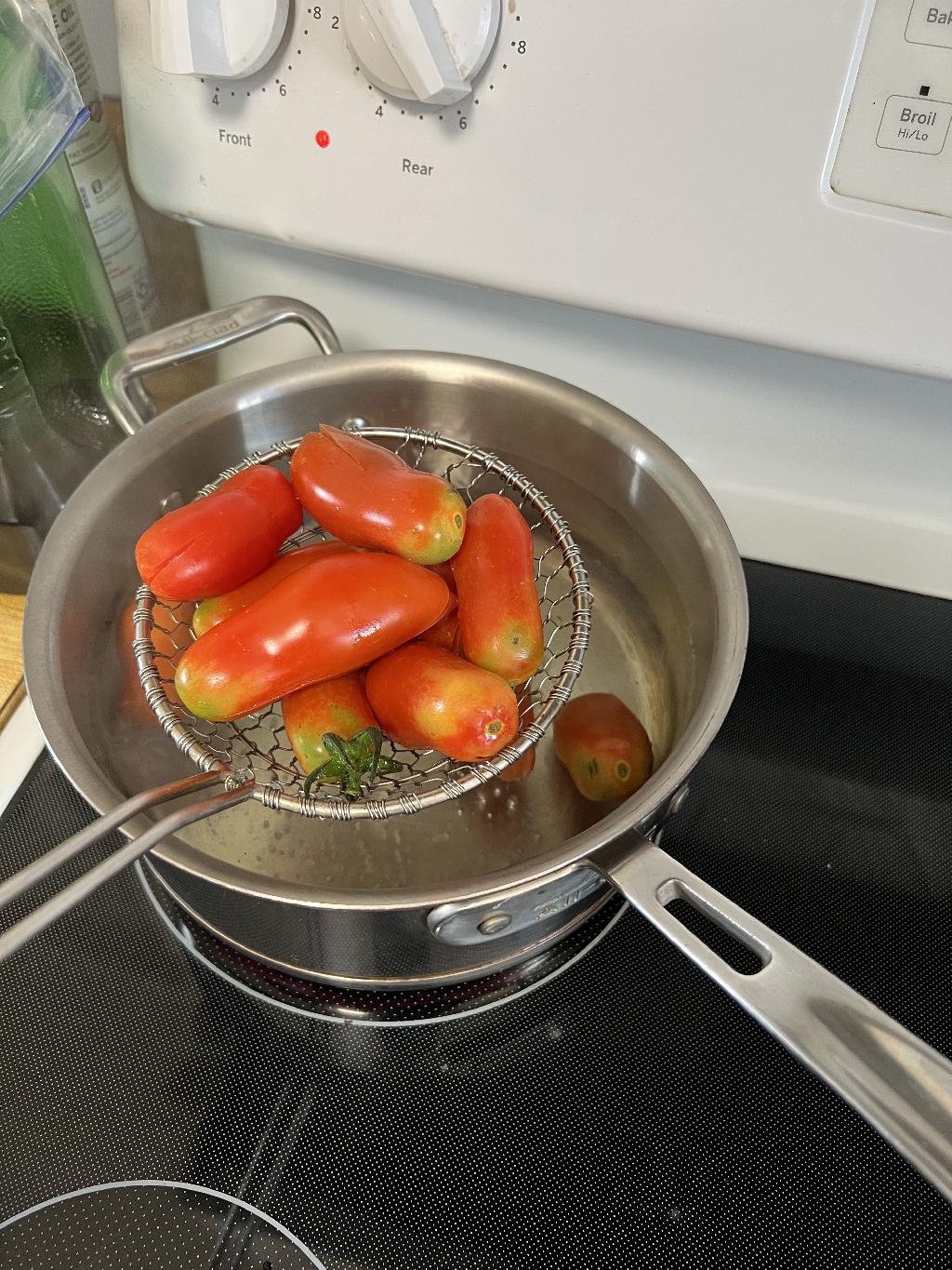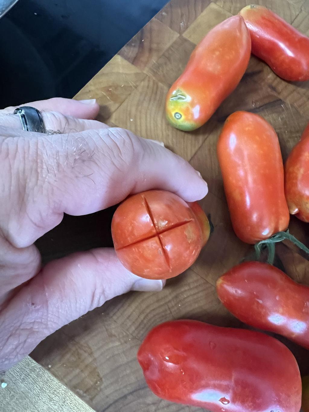 Step #7 The skins should peel right off with ease. Alternately, instead of the boiling water method, my wife will slice her tomatoes in half then place in the hot oven until the skin is slightly charred, then allow to cool before removing skins.