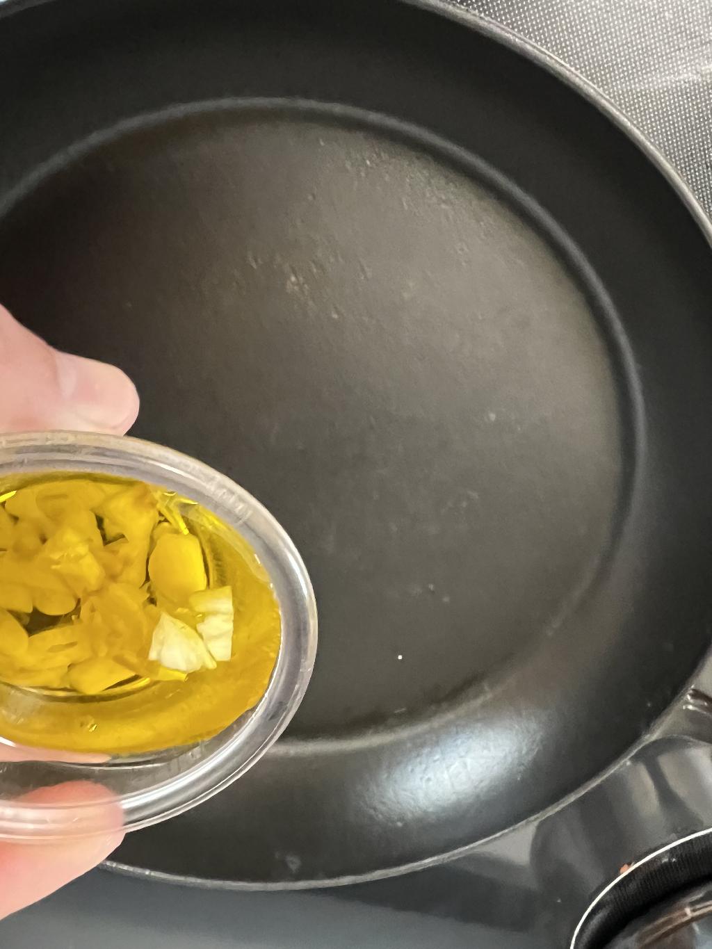 Step #9 Add a large, deep skillet to the stove, setting the heat to medium high. Pour in a tablespoon or two of your garlic infused olive oil.