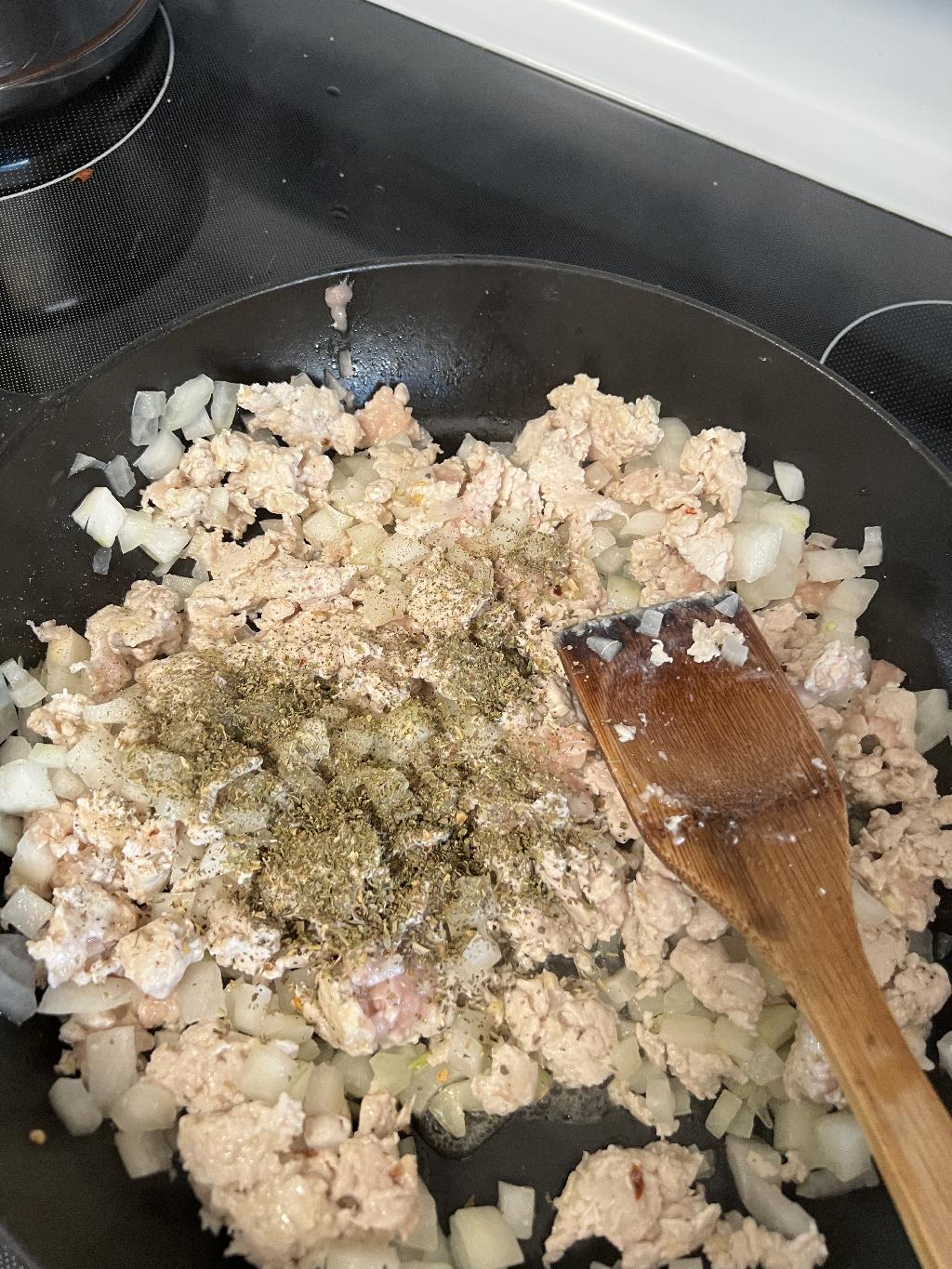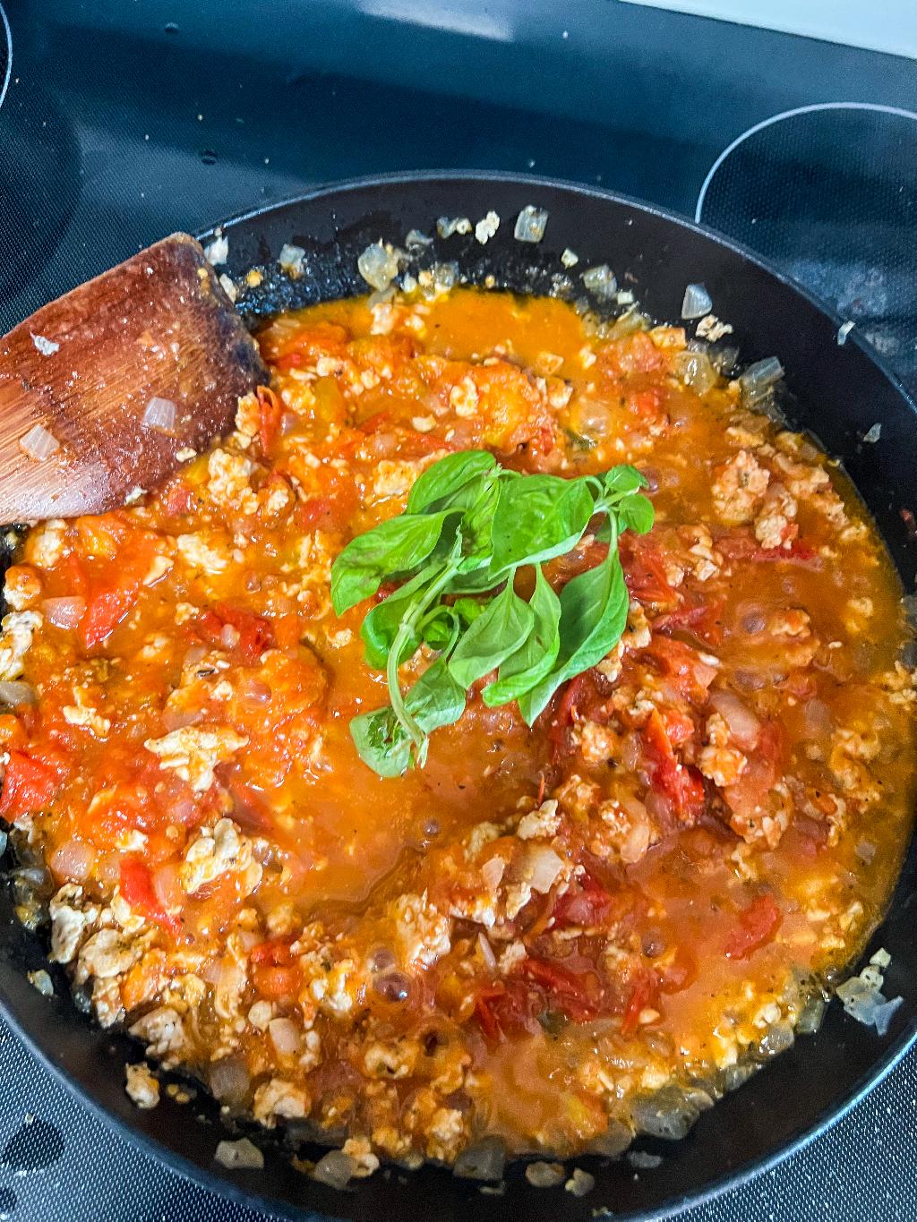 Step #21 Remove Fresh Basil stem and sprinkle in some dried Basil. Taste and add any additional seasoning you think it needs.