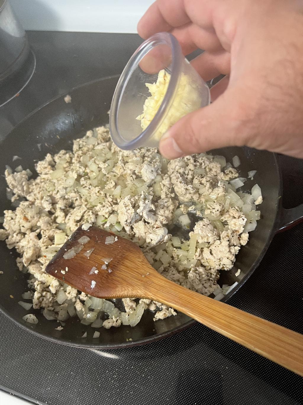 Step #14 Once Pheasant is browned and Onion are translucent, add in diced Garlic.