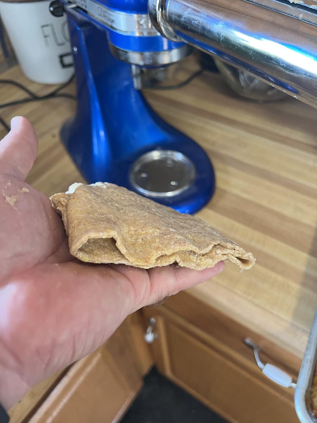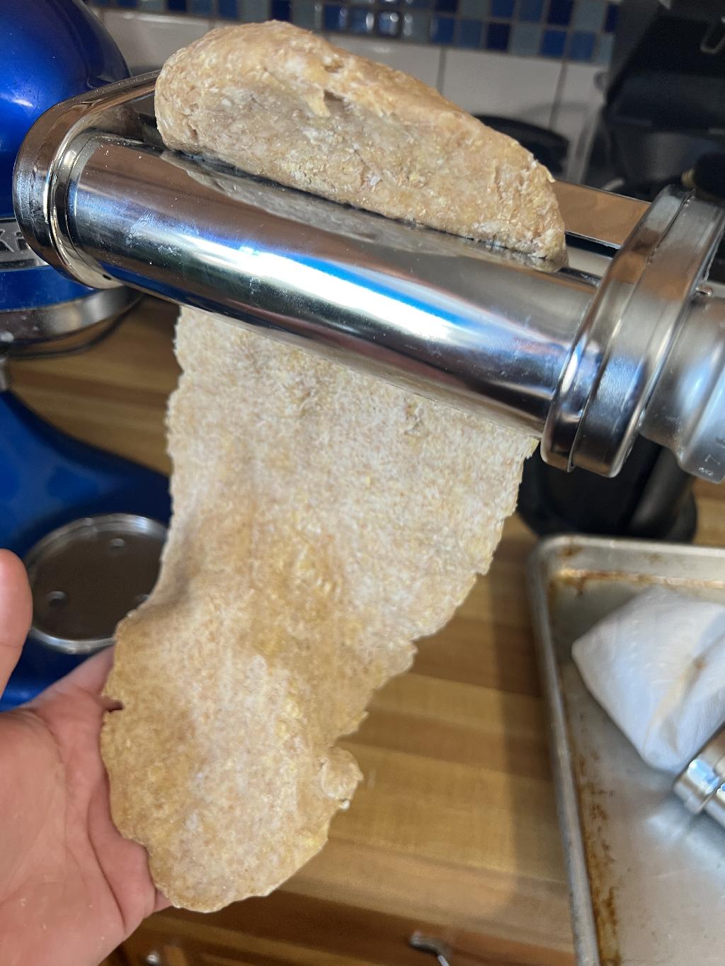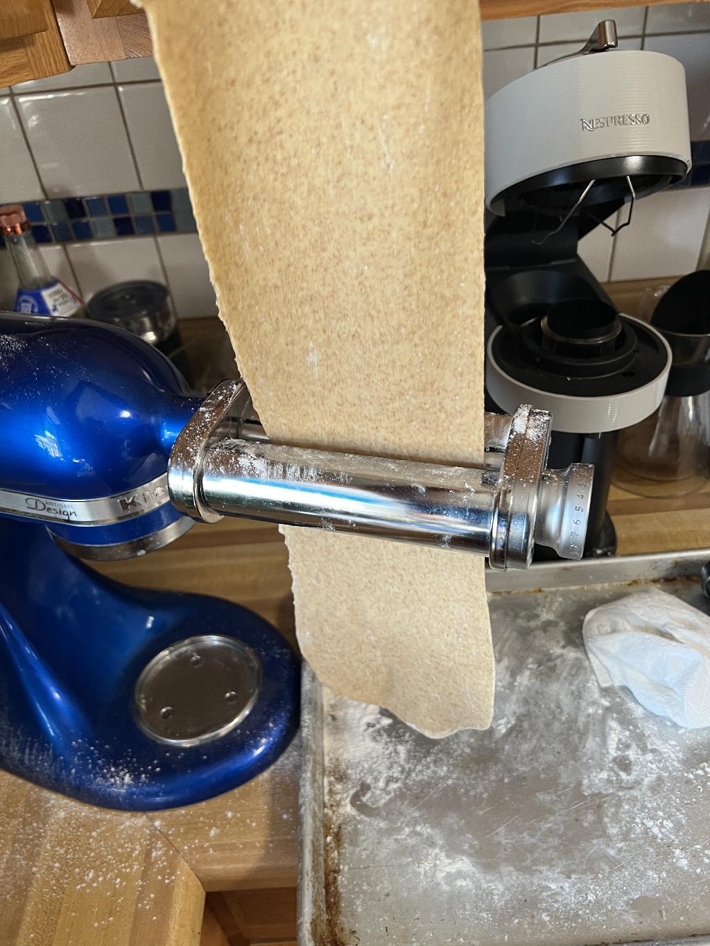 Step #22 Now that the sauce is done, it's time to start back on the pasta. If you have a stand mixer with a pasta attachment, set it to the widest setting and lowest speed. Flatten your dough enough to run through attachment. Keep sprinkling attachment with flour to keep dough from sticking.