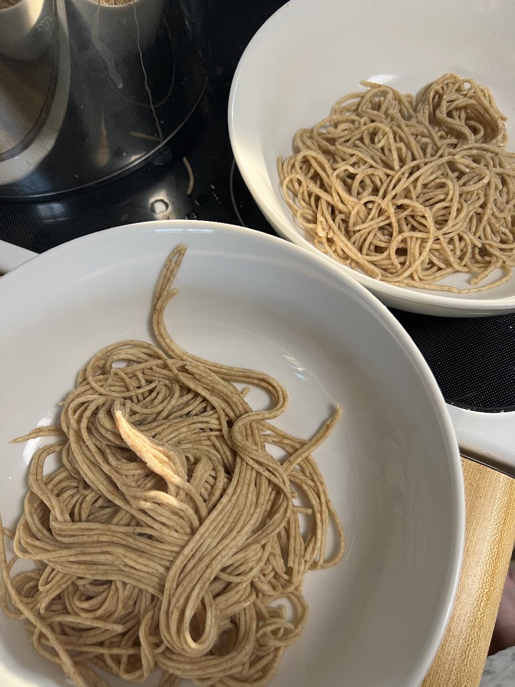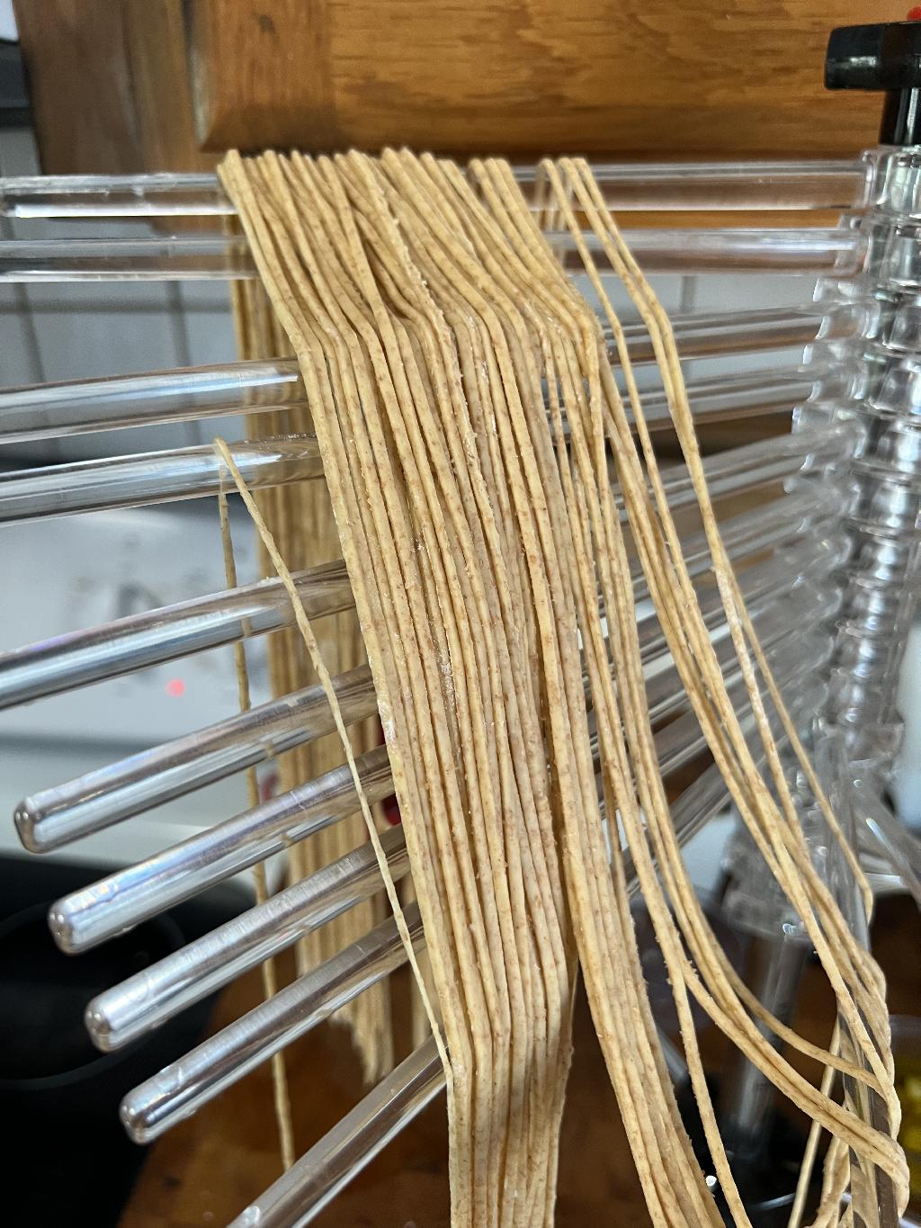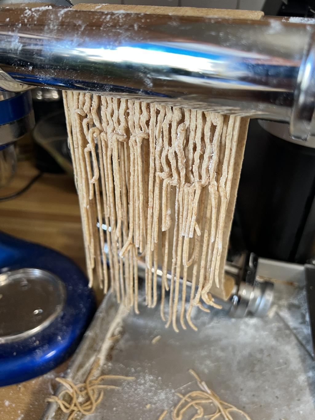 Step #25 Once you have the desired thickness, switch attachments to the spaghetti noodle attachment. Cut your long pasta sheets into workable sizes, then run through spaghetti attachment.