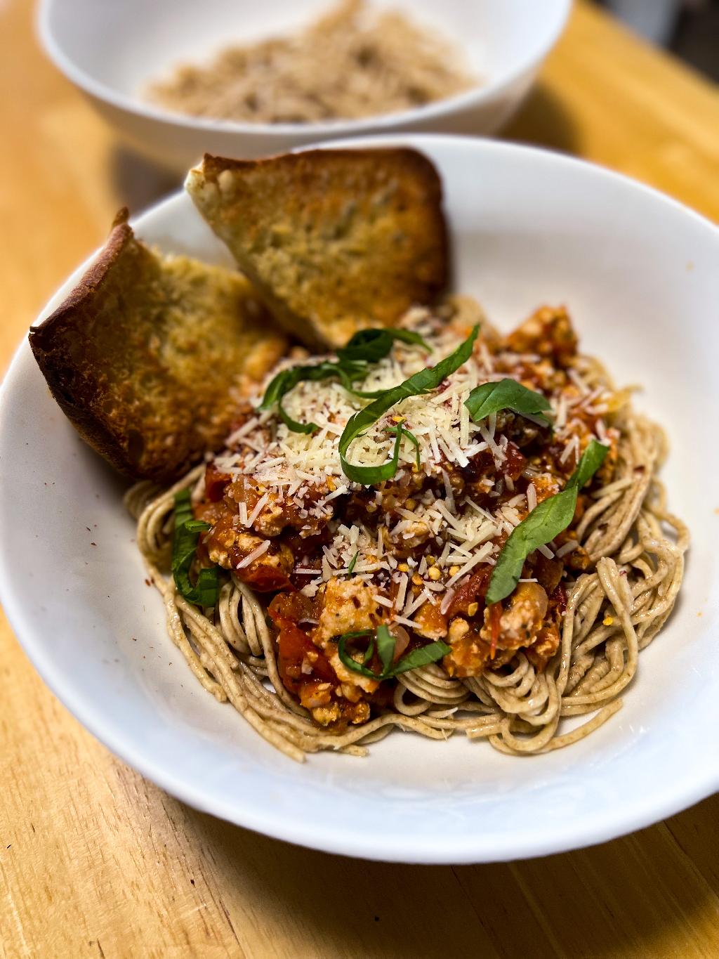 Step #32 Top noodles with our pasta sauce and garnish with freshly grated parmesan cheese and fresh basil.