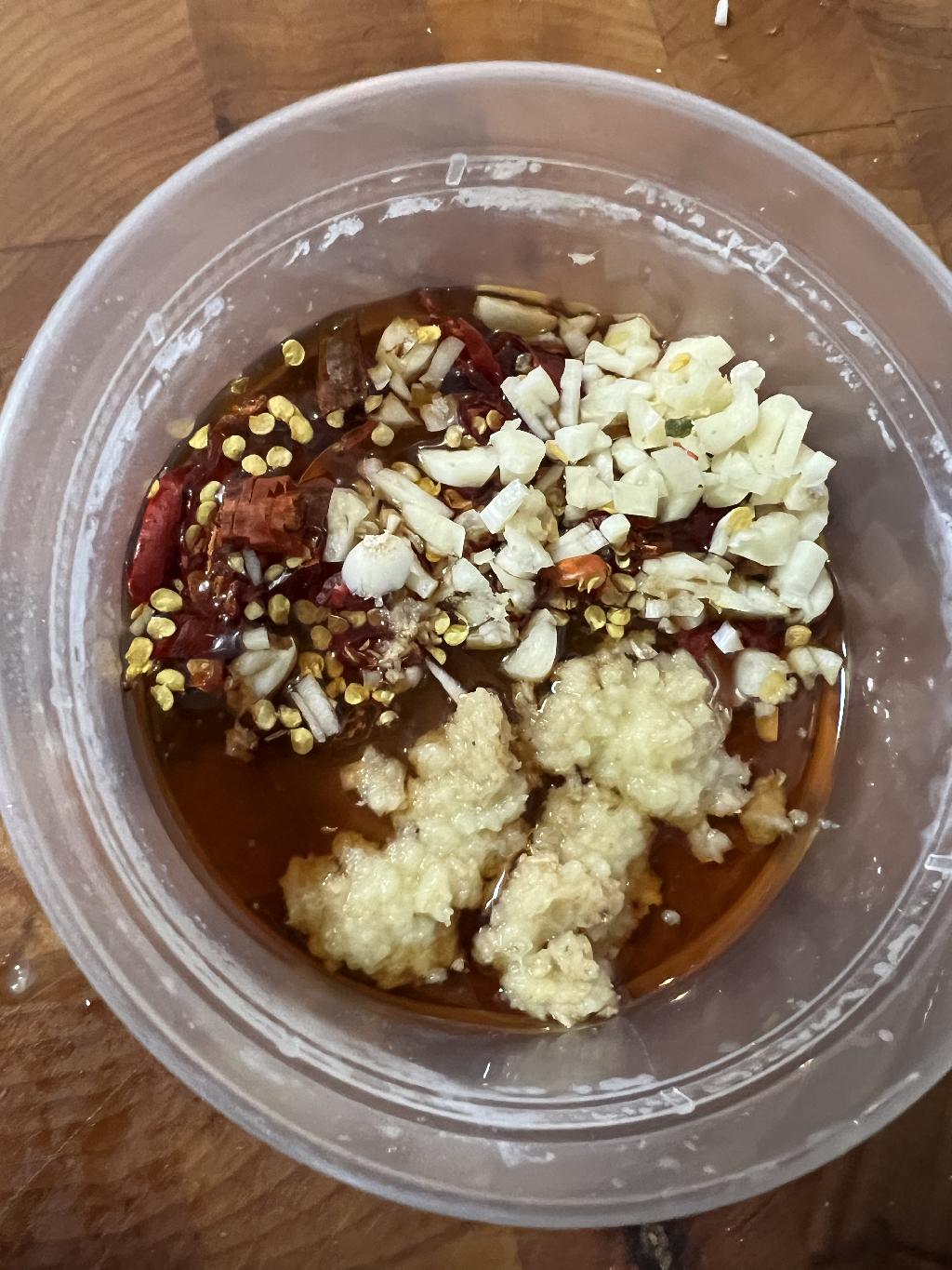 Step #3 Add a couple tablespoons of sesame oil to a small container. Add in sliced peppers and garlic. Grate in about one tablespoon of ginger. Allow this to sit around a few hours while your Pheasant marinates in the fridge.