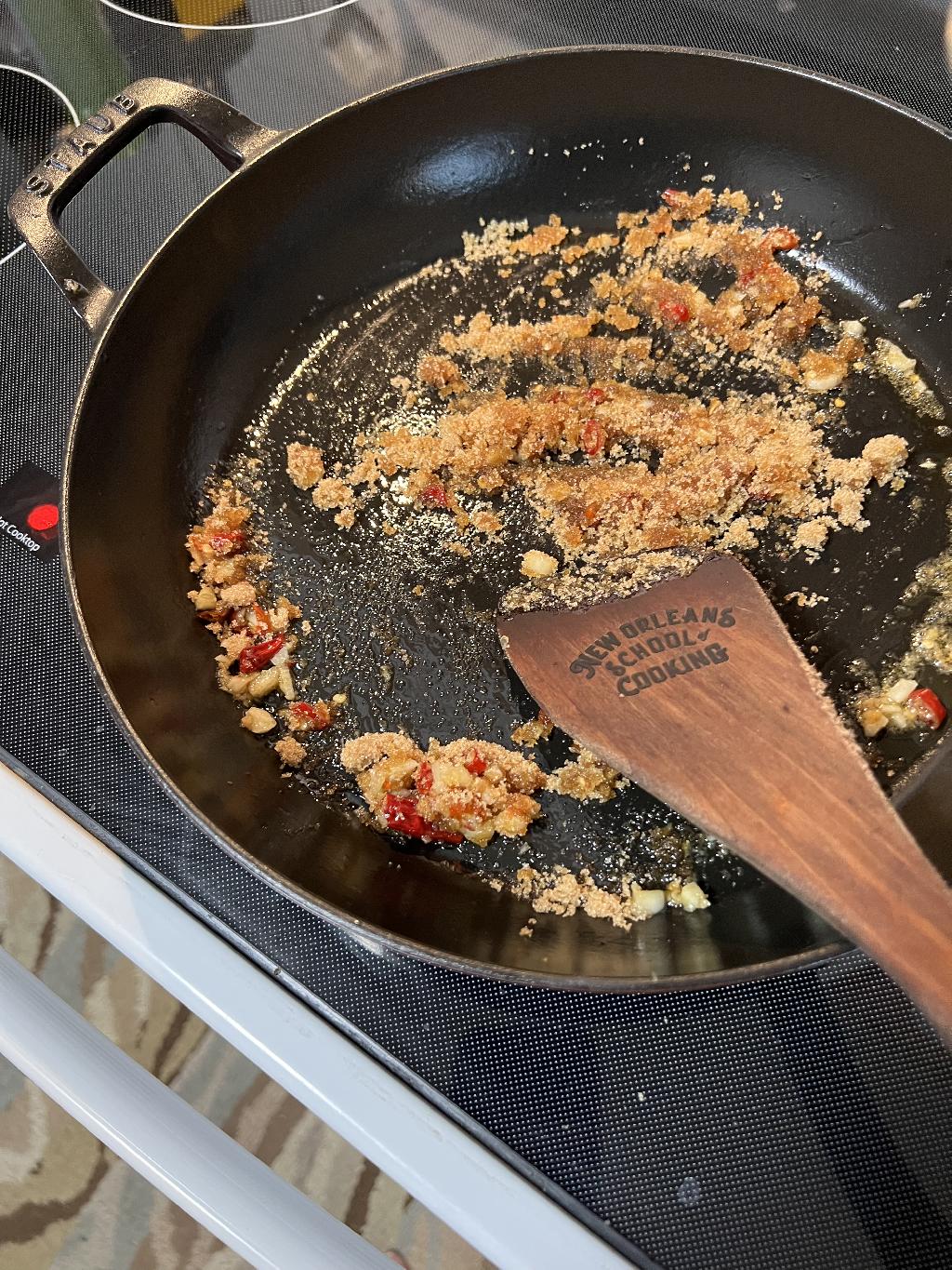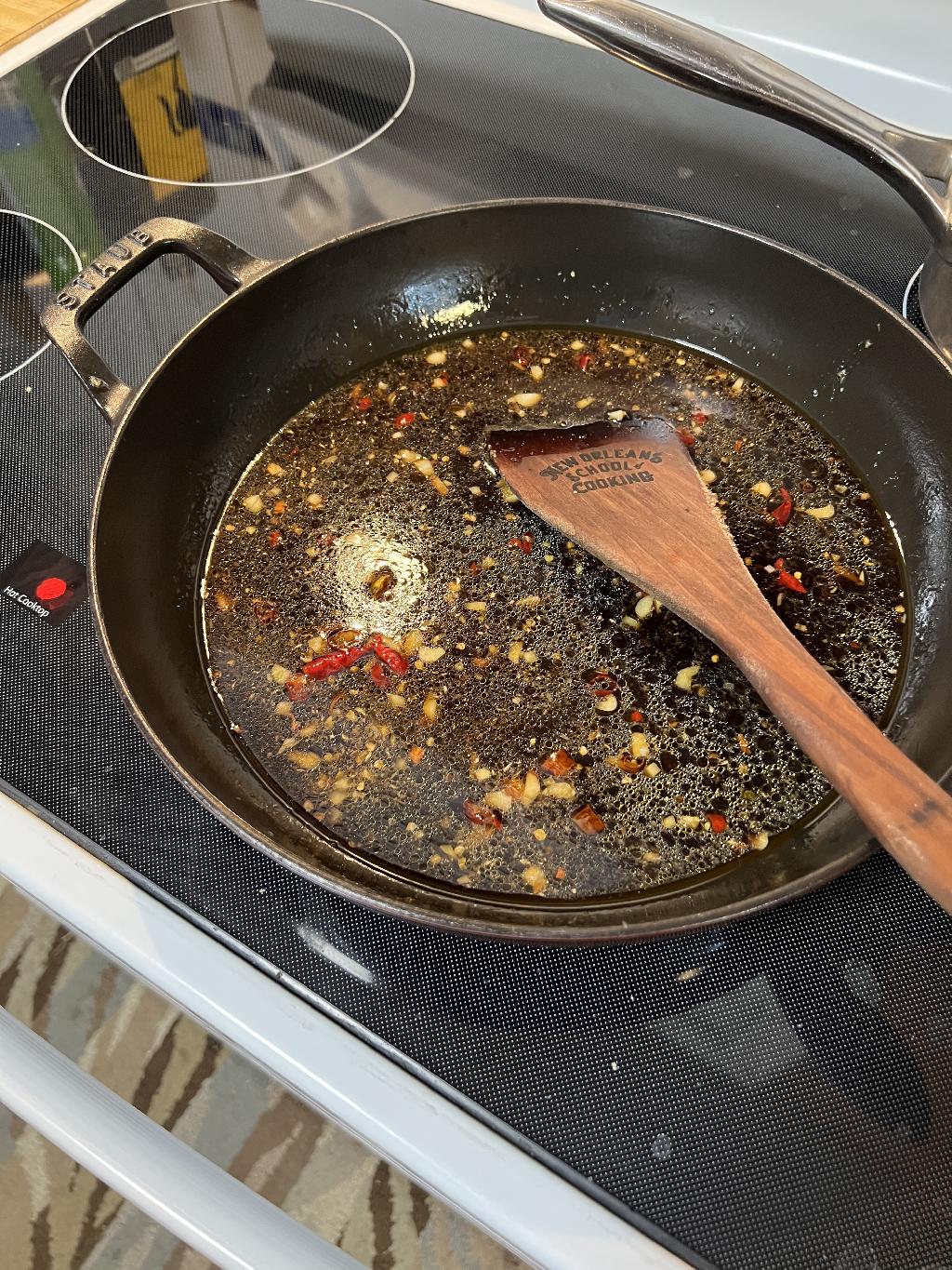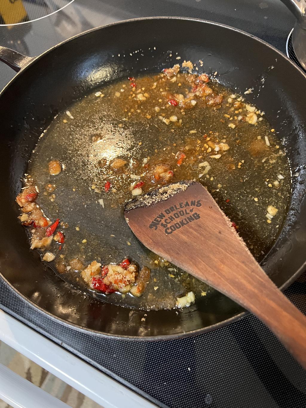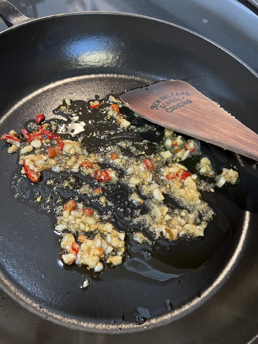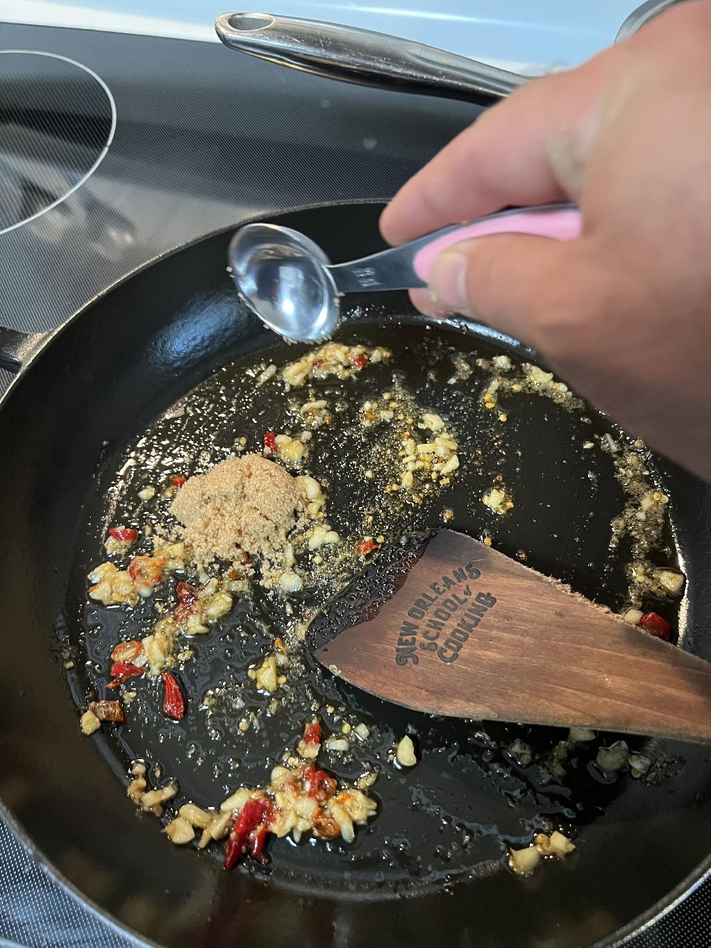 Step #6 Stir around until sugar is combined with oil. Allow to cook for one minute.