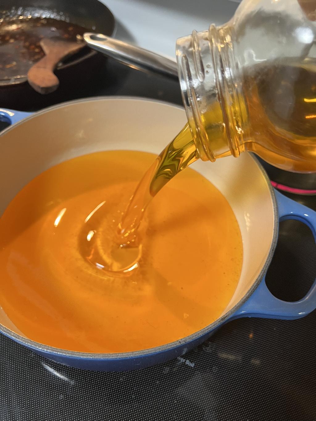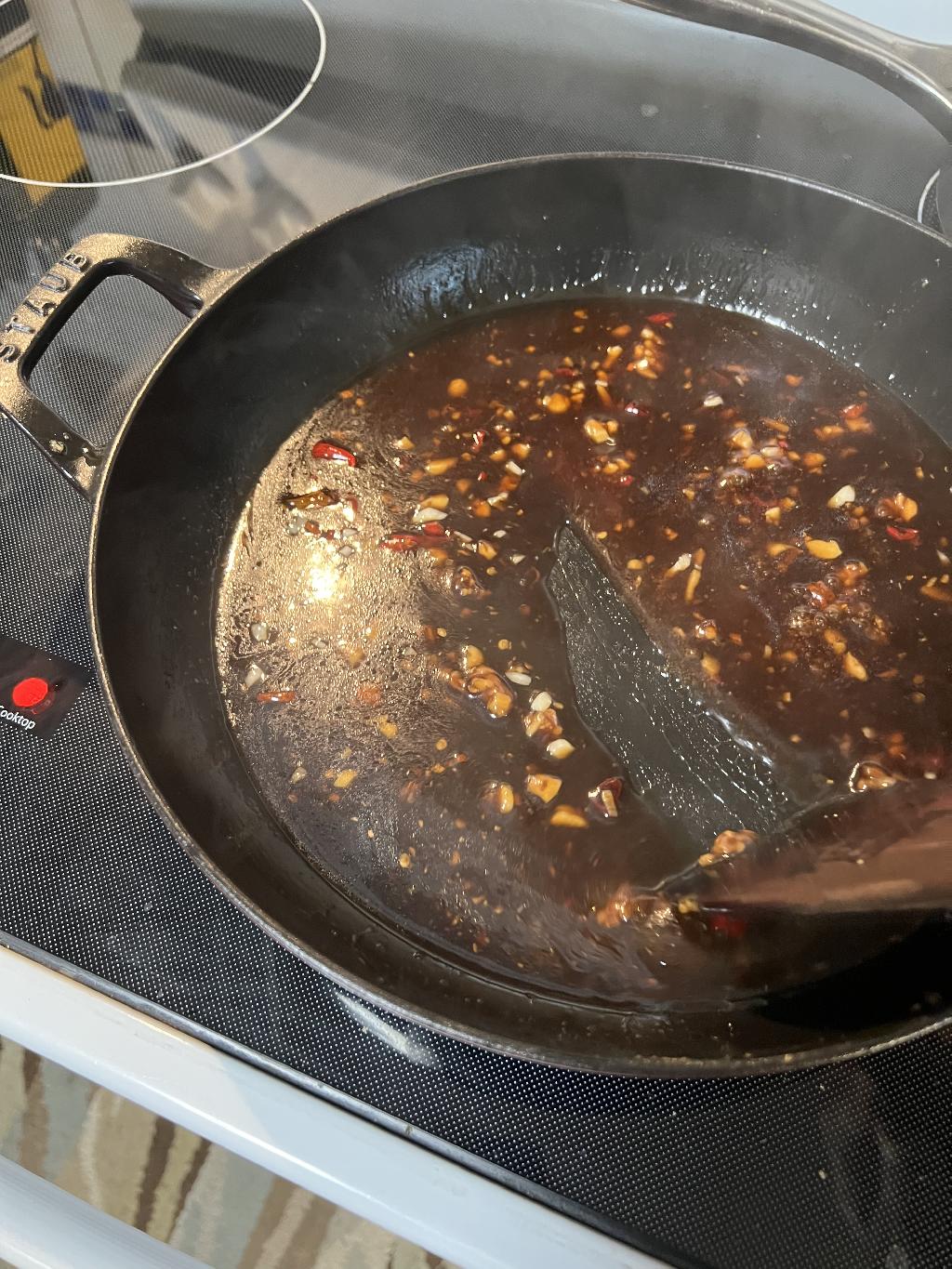 Step #4 Add a skillet to the stove top, setting heat to medium. Pour in our spicy sesame seed oil and allow to heat up and become fragrant.