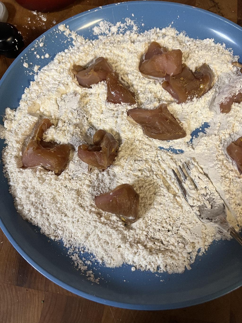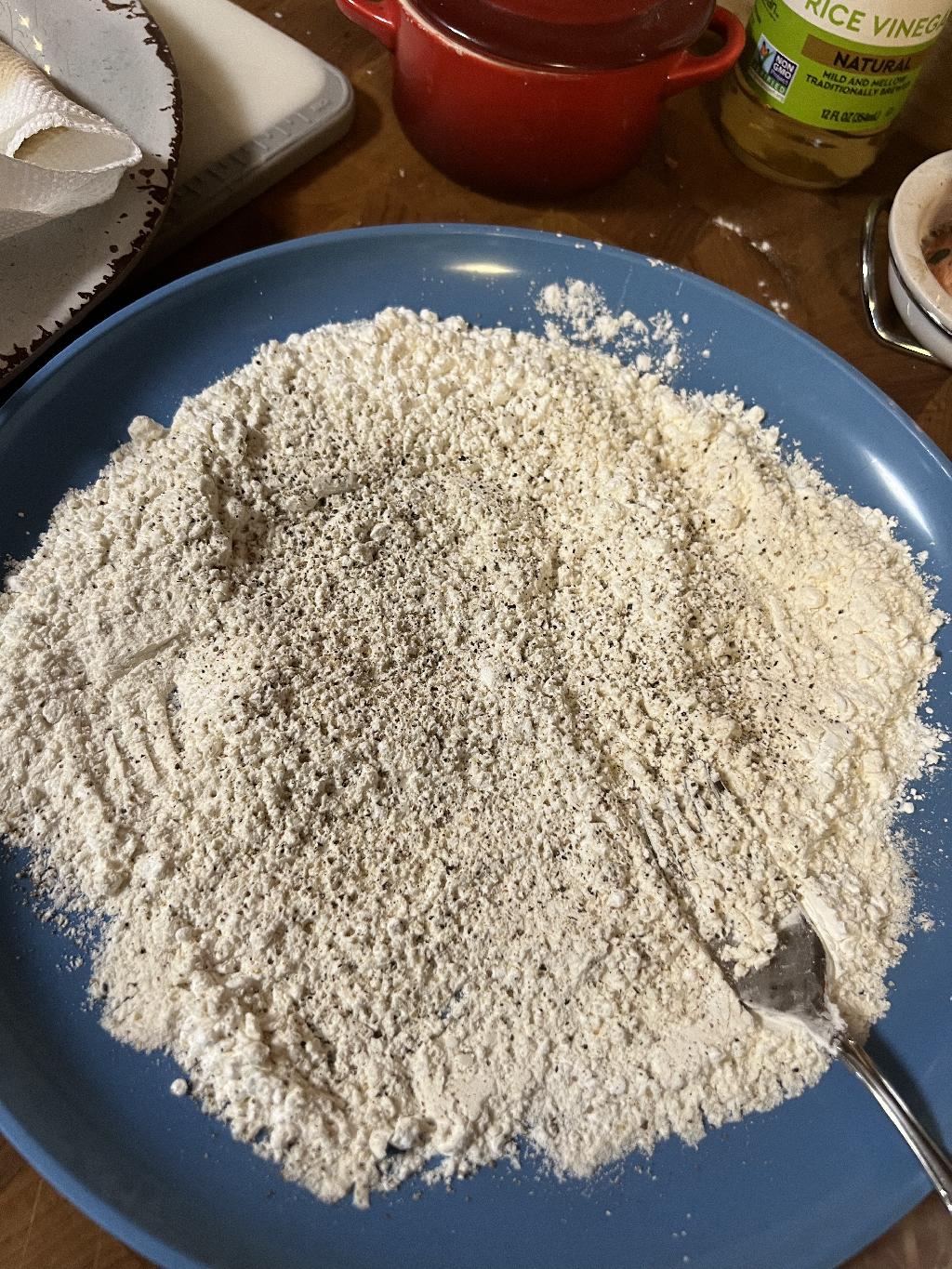 Step #5 Setup dredging station by adding all purpose flour, cornstarch, salt and pepper to shallow bowl or plate. Use fork to combine ingredients.