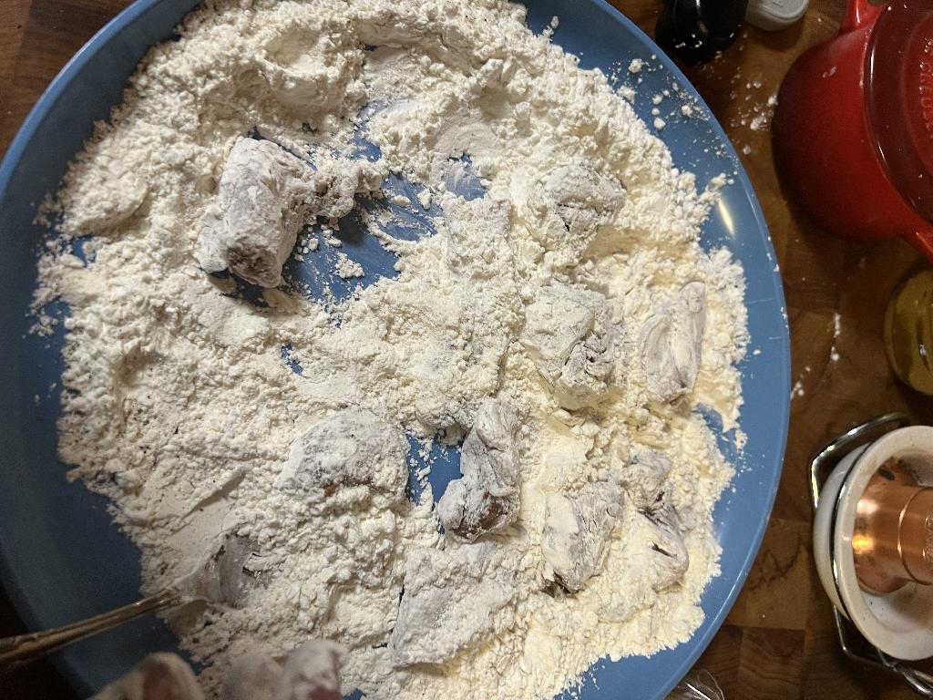 Step #8 When oil reach 350 degrees, drop Pheasant pieces in a few at a time. Cook for only a few minutes, until browned.