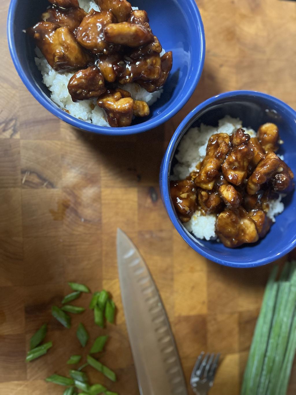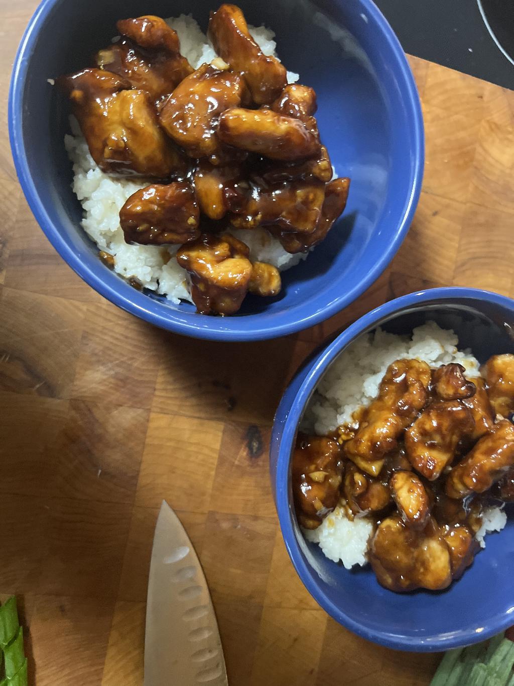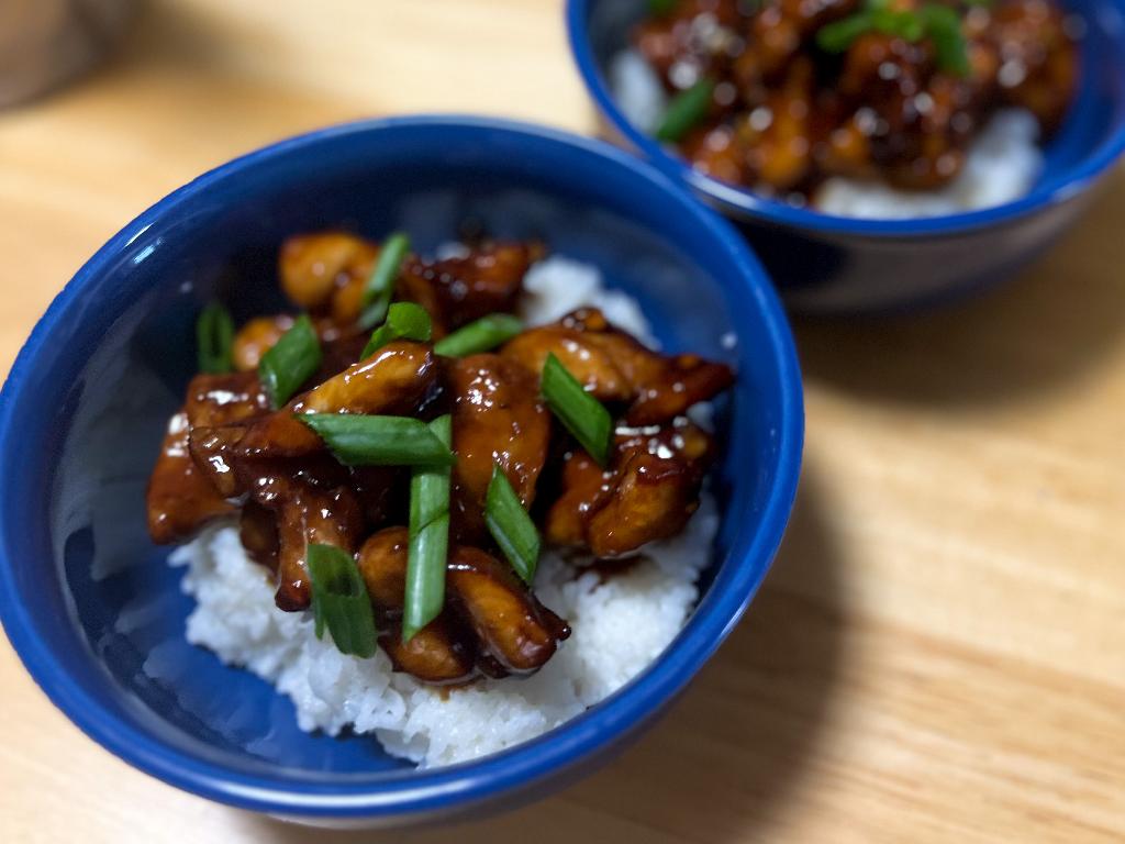 Step #13 Add white rice to bowl and top with coated Pheasant.