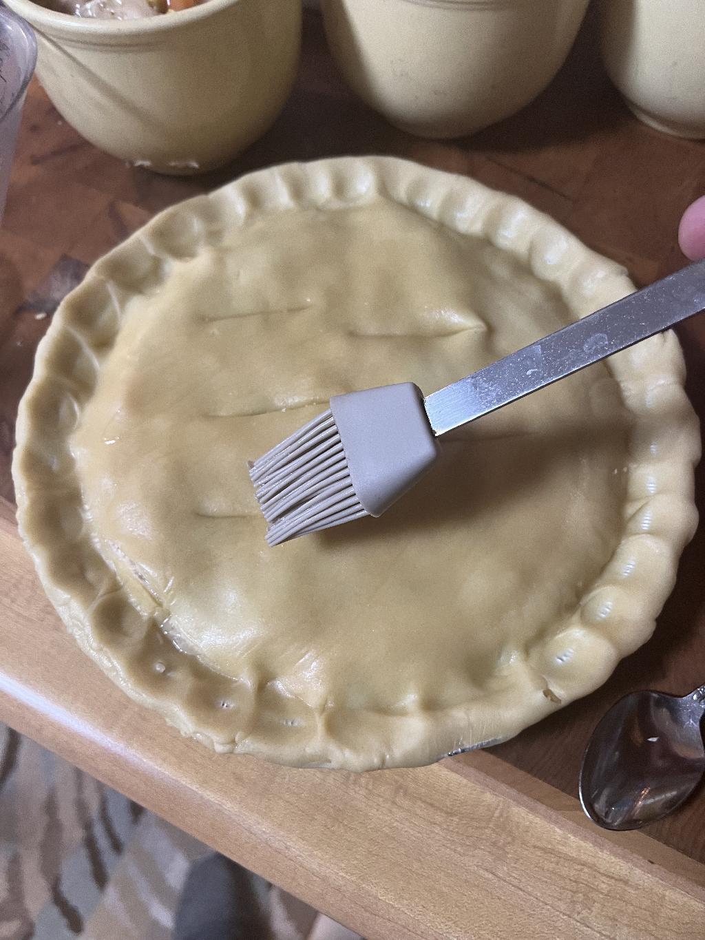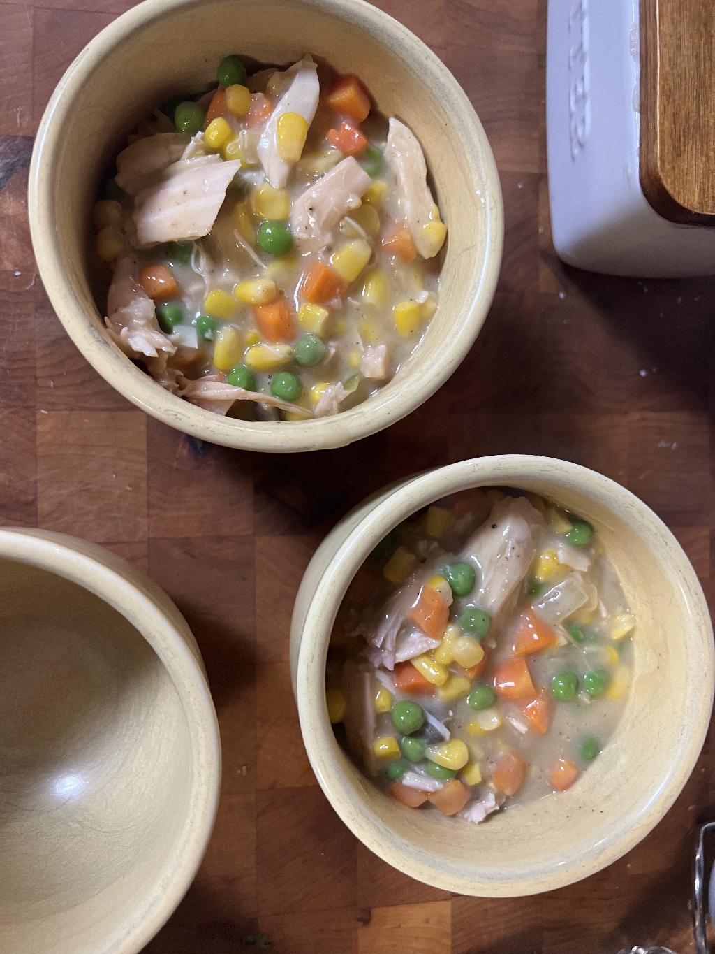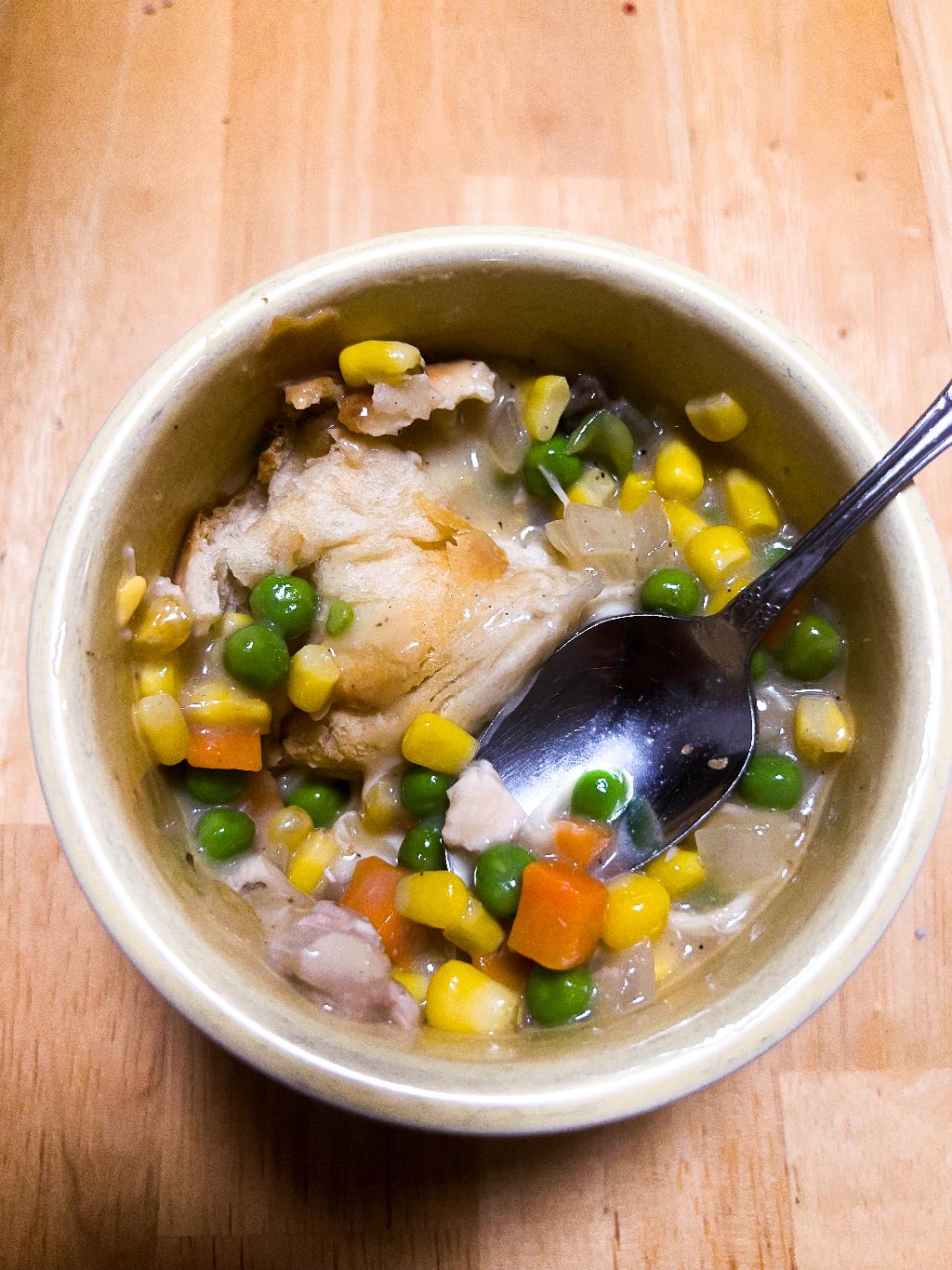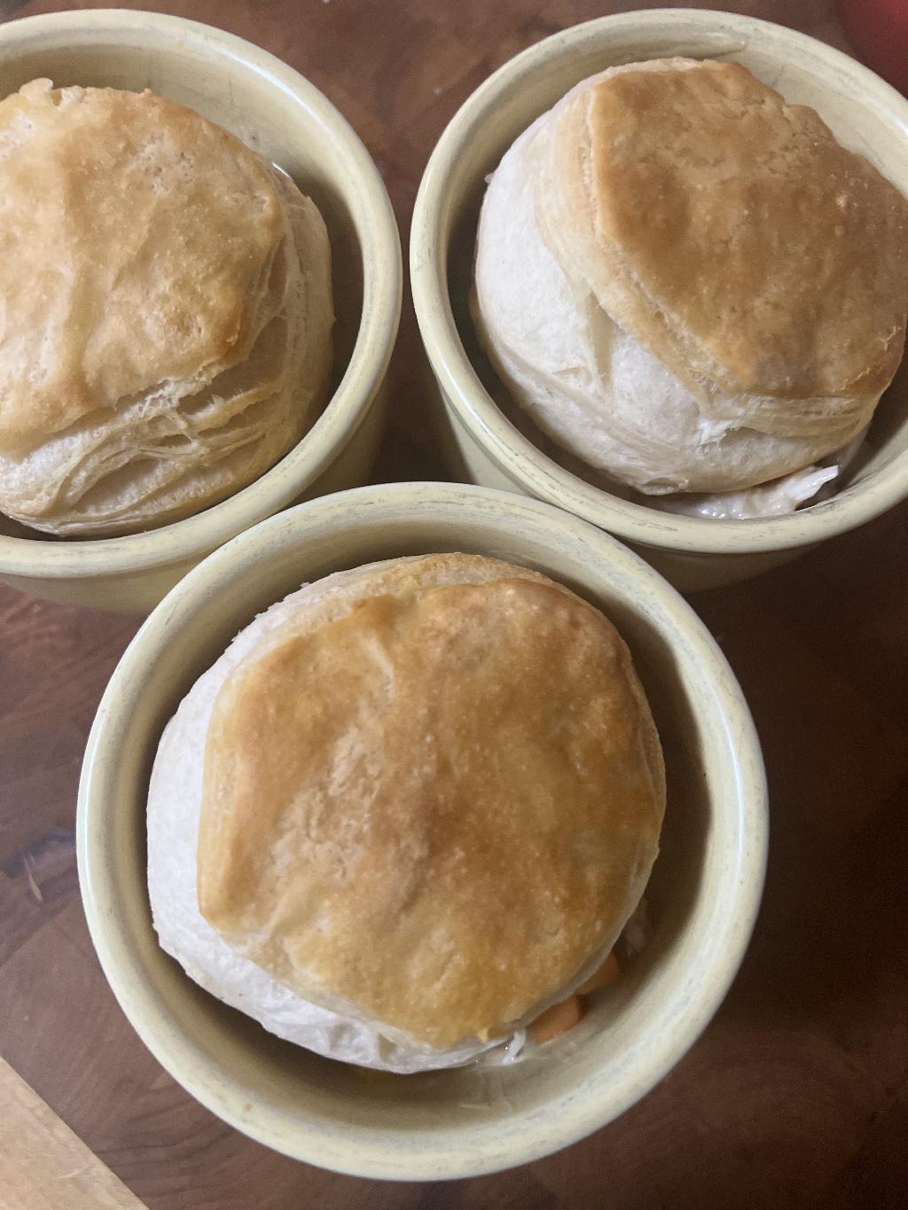 These pot pies were just meant to be a quick meal I could make after work. I just cooked the filling then ladled it into some ramekins and covered with a hot, flakey biscuit. It turned out to be really, really good. You can make this more traditional by adding the filling to a pie tin. It just so happens that I had also purchased a package of frozen pie crust and ended up making this both ways. Each pie crust package came with two tins and two frozen pie crust, basically two pies or one top crust and one bottom crust. If you’ll set the pie crust out of the freezer when you start cooking the filling, they should be thawed enough to work with by the time the filling is done. Fill one of the pie crusts with your filling, spreading out to make an even layer. Take the other pie crust and carefully peel it always from the pie tin, be careful not to break or tear it, once free, place over top of the other pie crust with the filling. Use your fingers or spoon to pinch/seal the edges of the crust. Use a sharp knife to cut a few small slits in the top of the pie crust, so steam and escape while it cooks. Brush the top with egg wash and sprinkle the top with a little salt. Place in a hot oven, 400 degrees, for about 15 minutes. Allow to cool then enjoy.