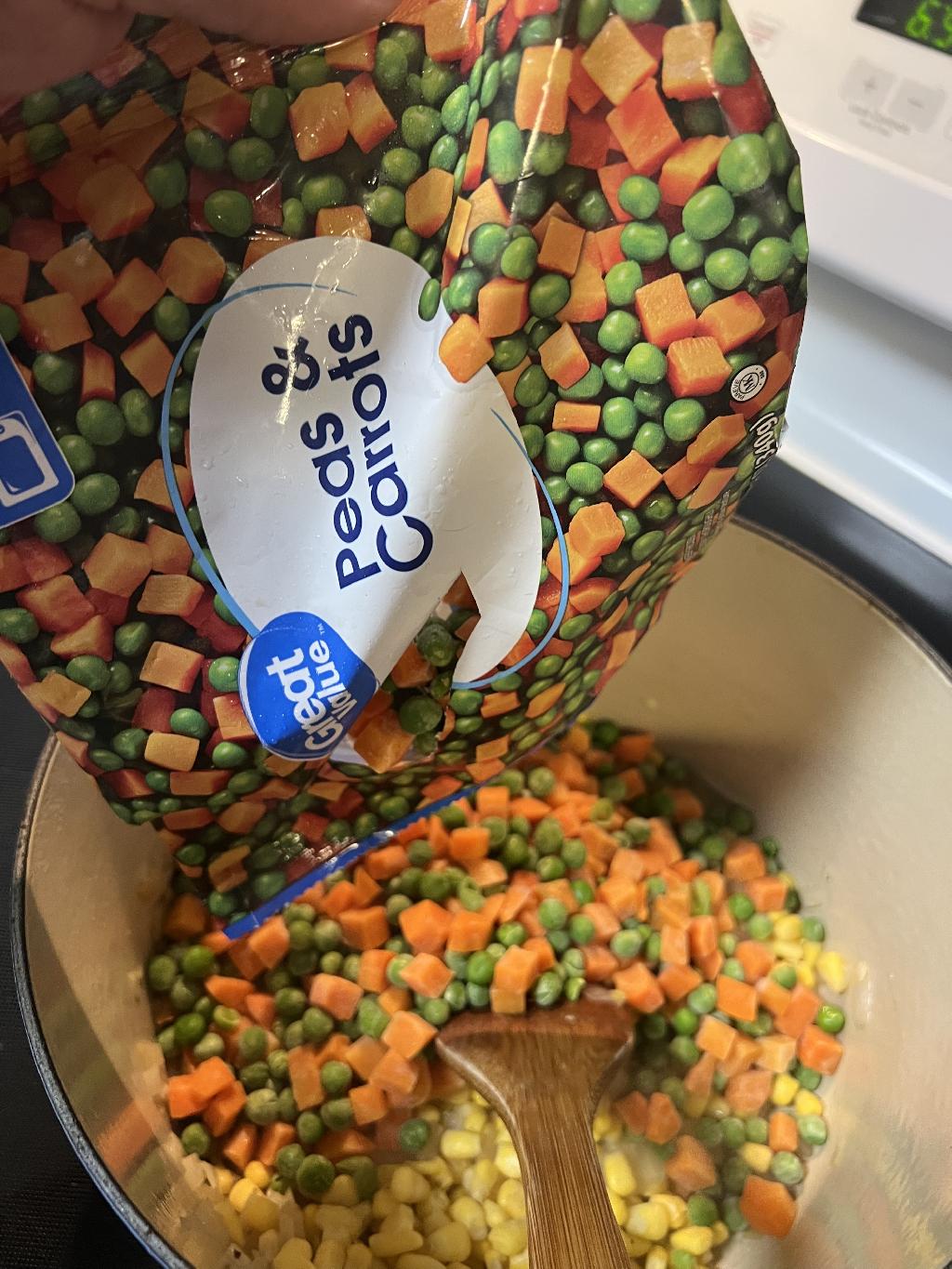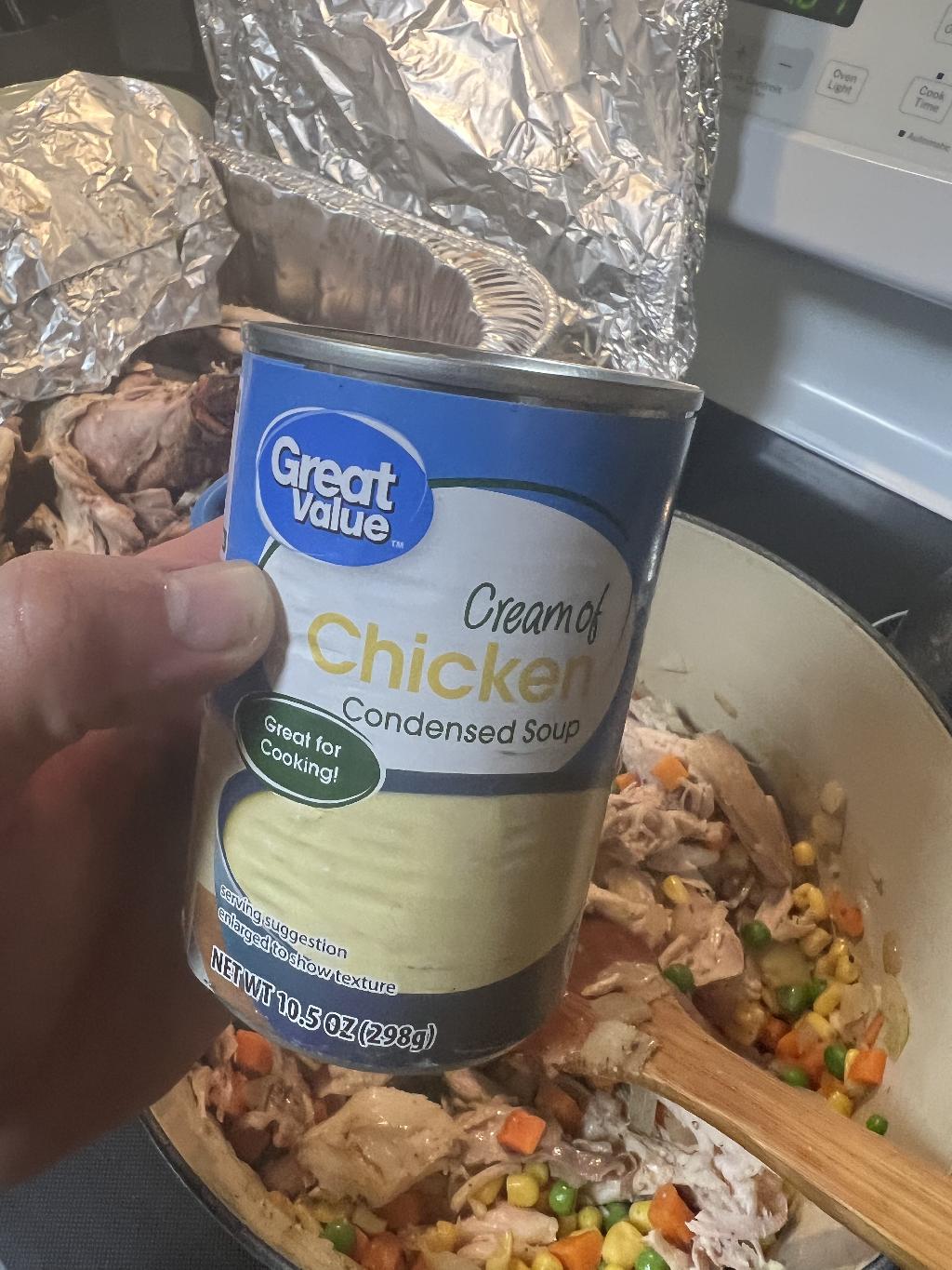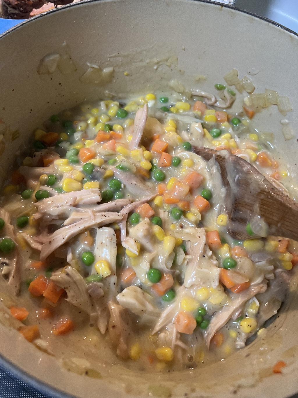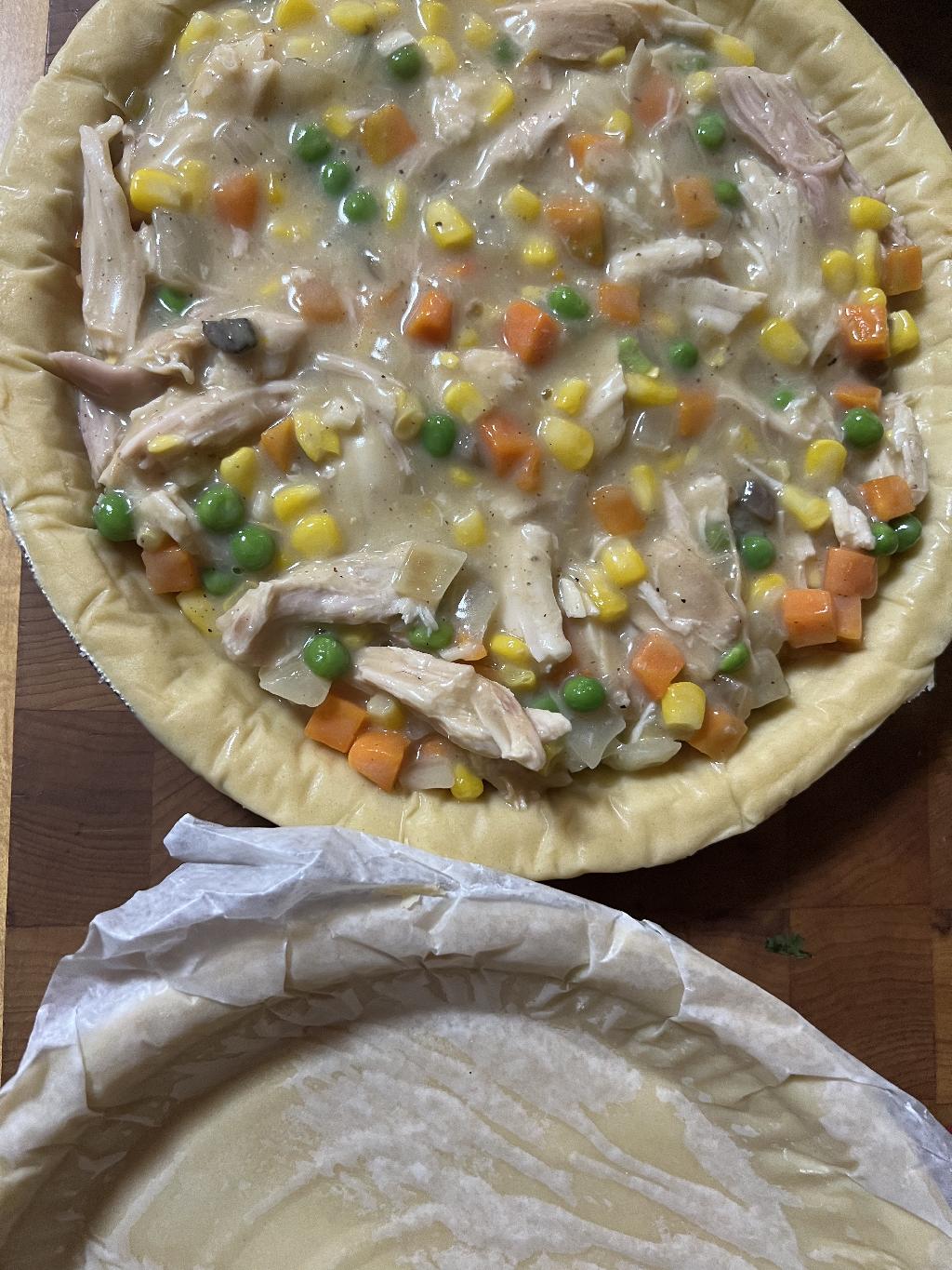 These pot pies were just meant to be a quick meal I could make after work. I just cooked the filling then ladled it into some ramekins and covered with a hot, flakey biscuit. It turned out to be really, really good. You can make this more traditional by adding the filling to a pie tin. It just so happens that I had also purchased a package of frozen pie crust and ended up making this both ways. Each pie crust package came with two tins and two frozen pie crust, basically two pies or one top crust and one bottom crust. If you’ll set the pie crust out of the freezer when you start cooking the filling, they should be thawed enough to work with by the time the filling is done. Fill one of the pie crusts with your filling, spreading out to make an even layer. Take the other pie crust and carefully peel it always from the pie tin, be careful not to break or tear it, once free, place over top of the other pie crust with the filling. Use your fingers or spoon to pinch/seal the edges of the crust. Use a sharp knife to cut a few small slits in the top of the pie crust, so steam and escape while it cooks. Brush the top with egg wash and sprinkle the top with a little salt. Place in a hot oven, 400 degrees, for about 15 minutes. Allow to cool then enjoy.