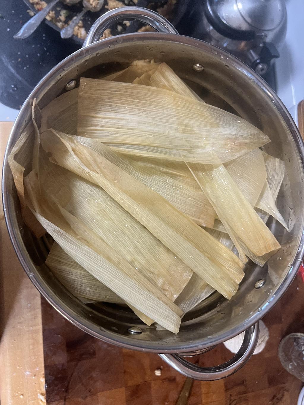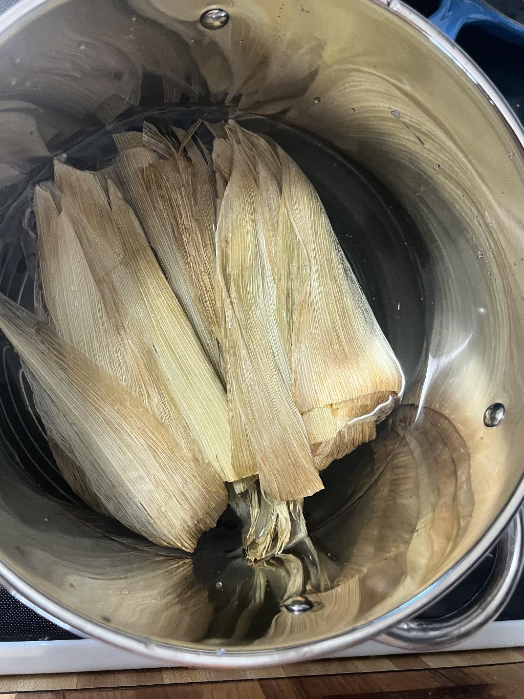 Step #1 Start by placing corn husk in a bowl of water and soaking at least 30 minutes.