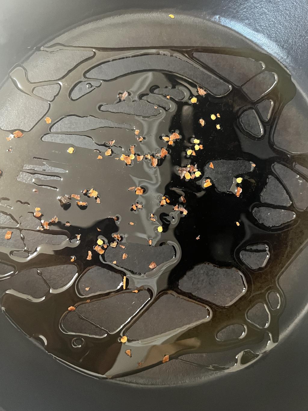 Step #3 Add 1 tablespoon of Olive Oil to large skillet and sprinkle in some red pepper flakes.