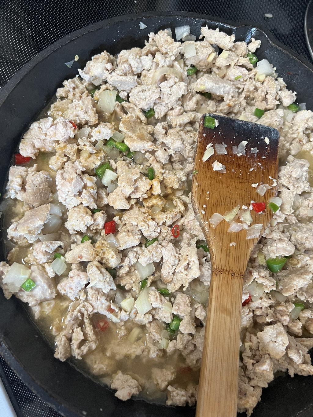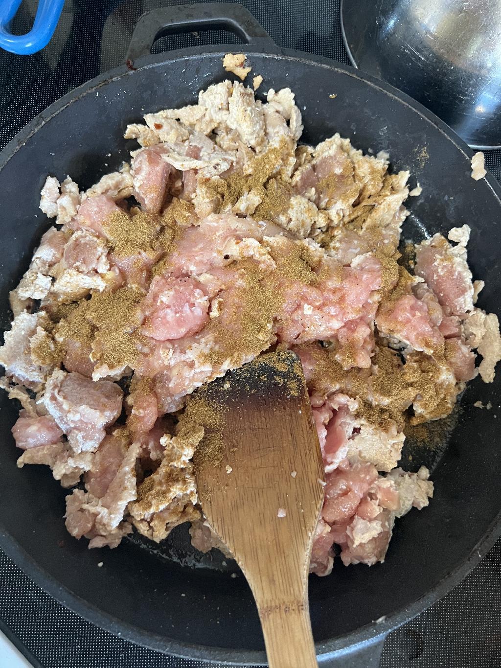 Step #4 Allow the oil to warm, then add ground pheasant. Add season with Salt, Pepper, Cumin and Paprika.