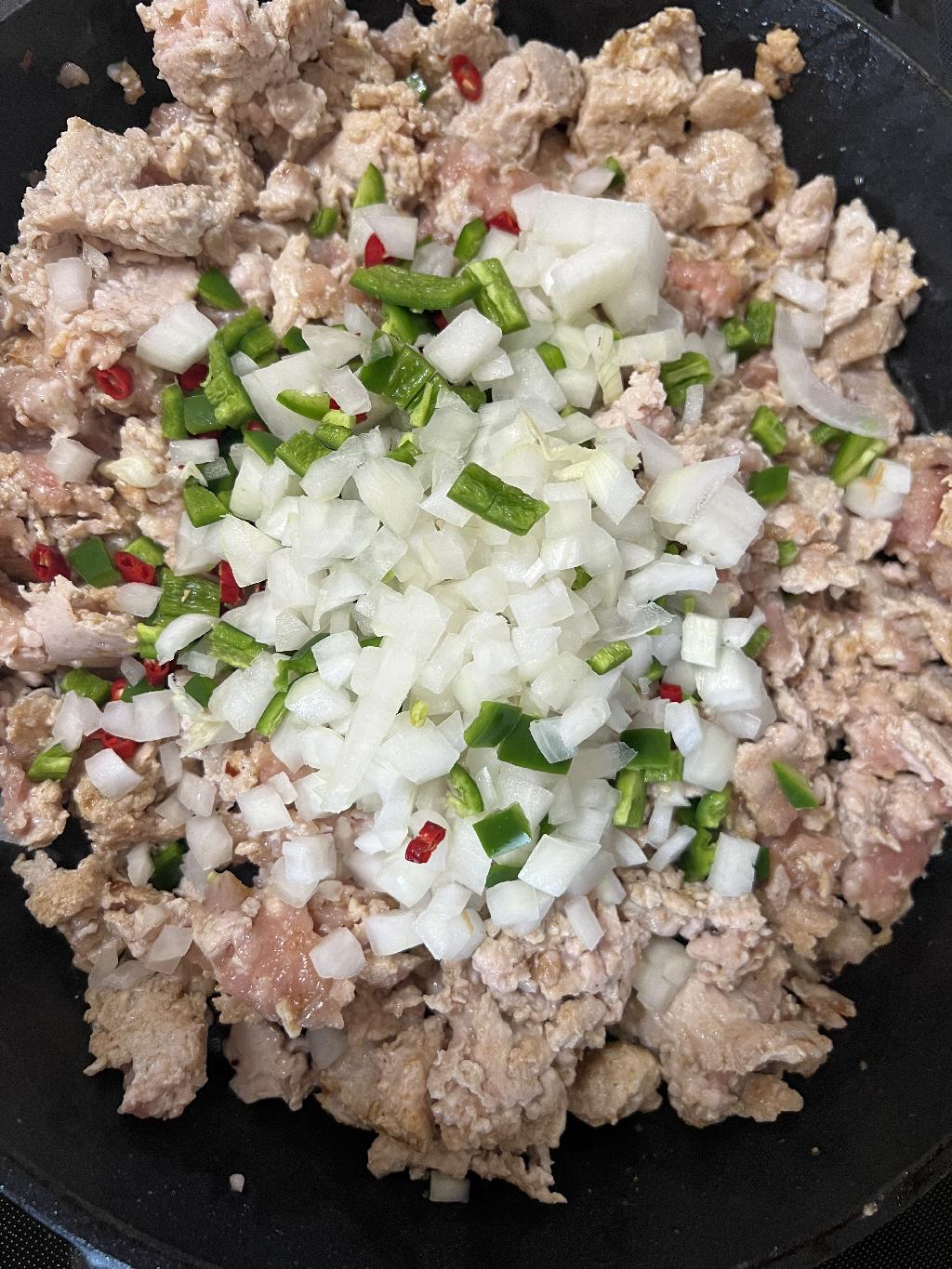 Step #5 Allow to brown for a few minutes, then add diced onions and peppers. When onions turn translucent, add minced garlic and cook for another minute.