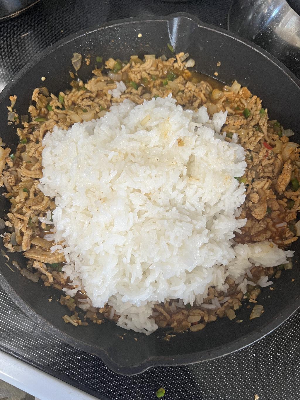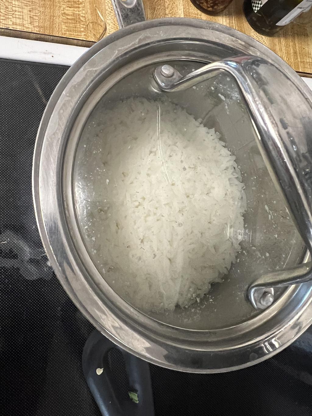 Step #7 In another saucepan add two cups of water and one cup of rice. Sprinkle in one teaspoon of salt. Bring to a simmer, the reduce and cover. Cook twenty minutes.