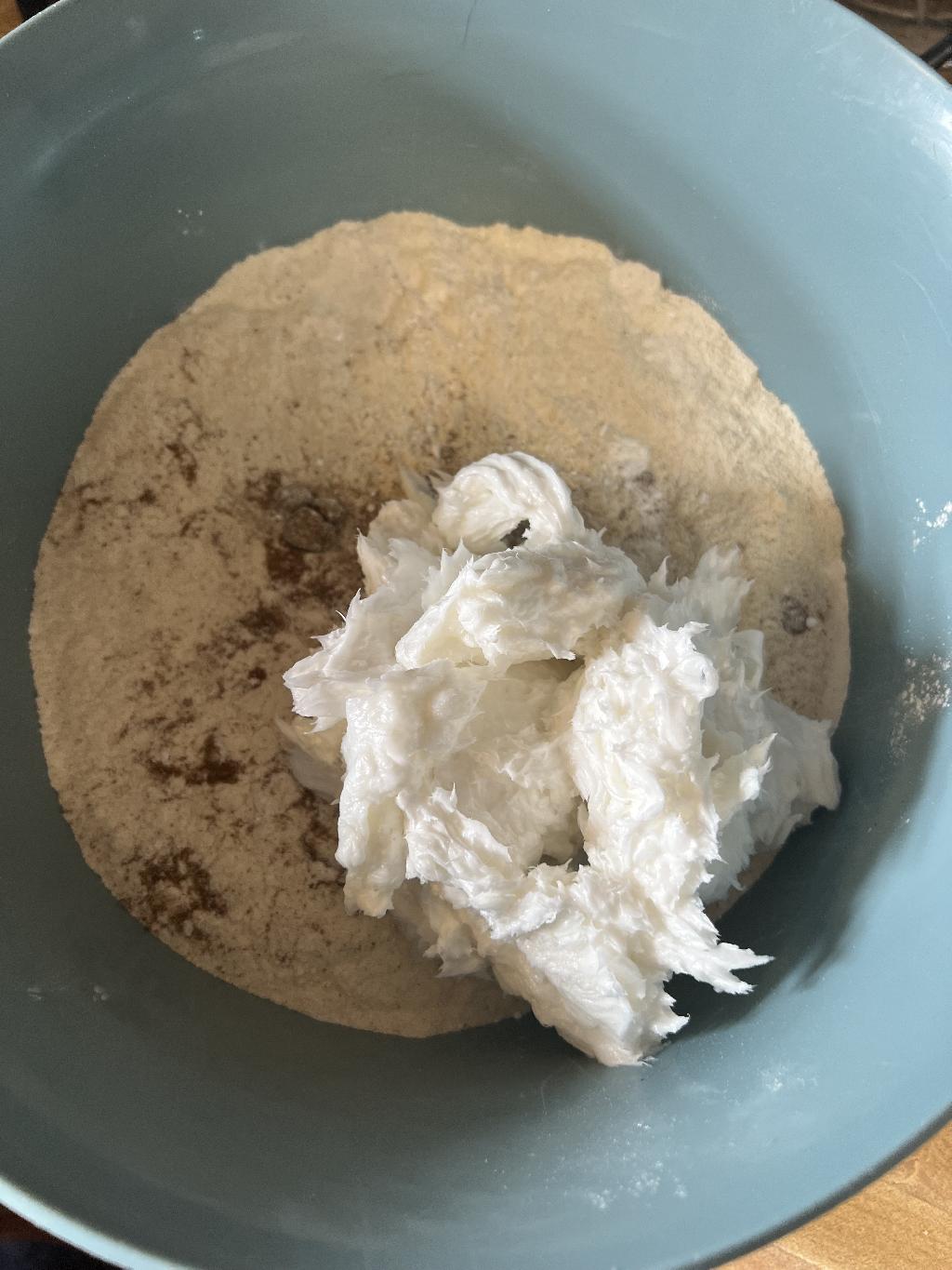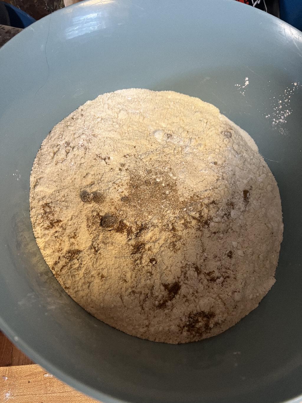 Step #3 Added Masa, baking powder, salt and cumin to another large bowl and combine.