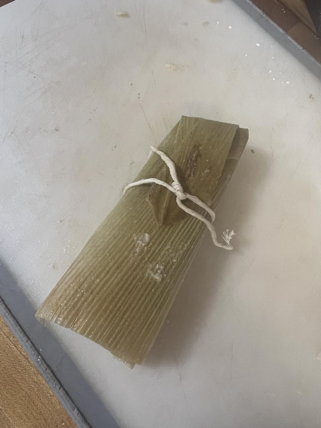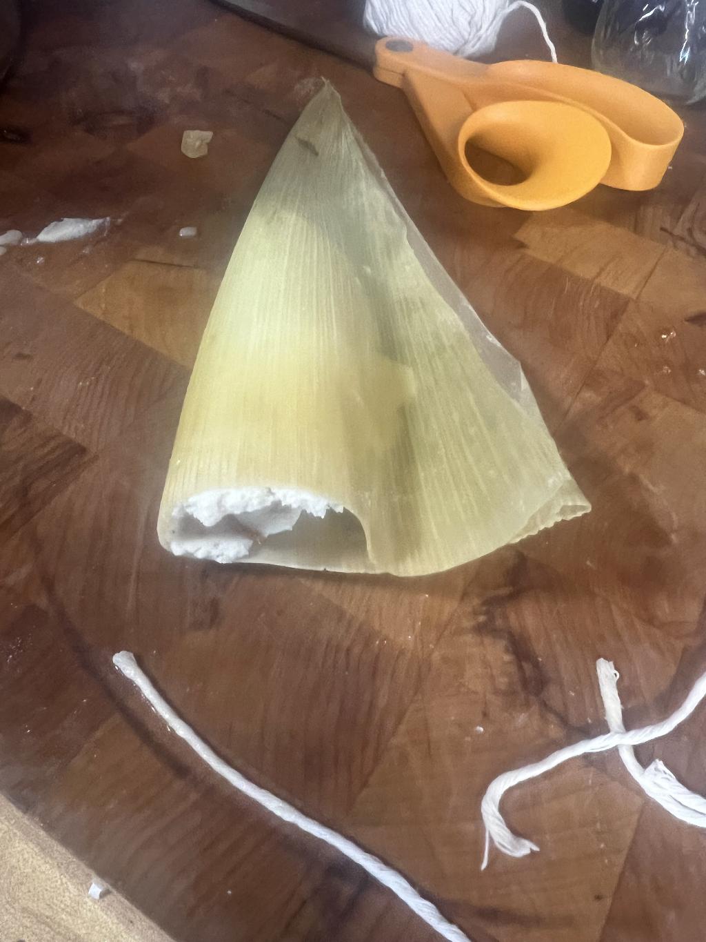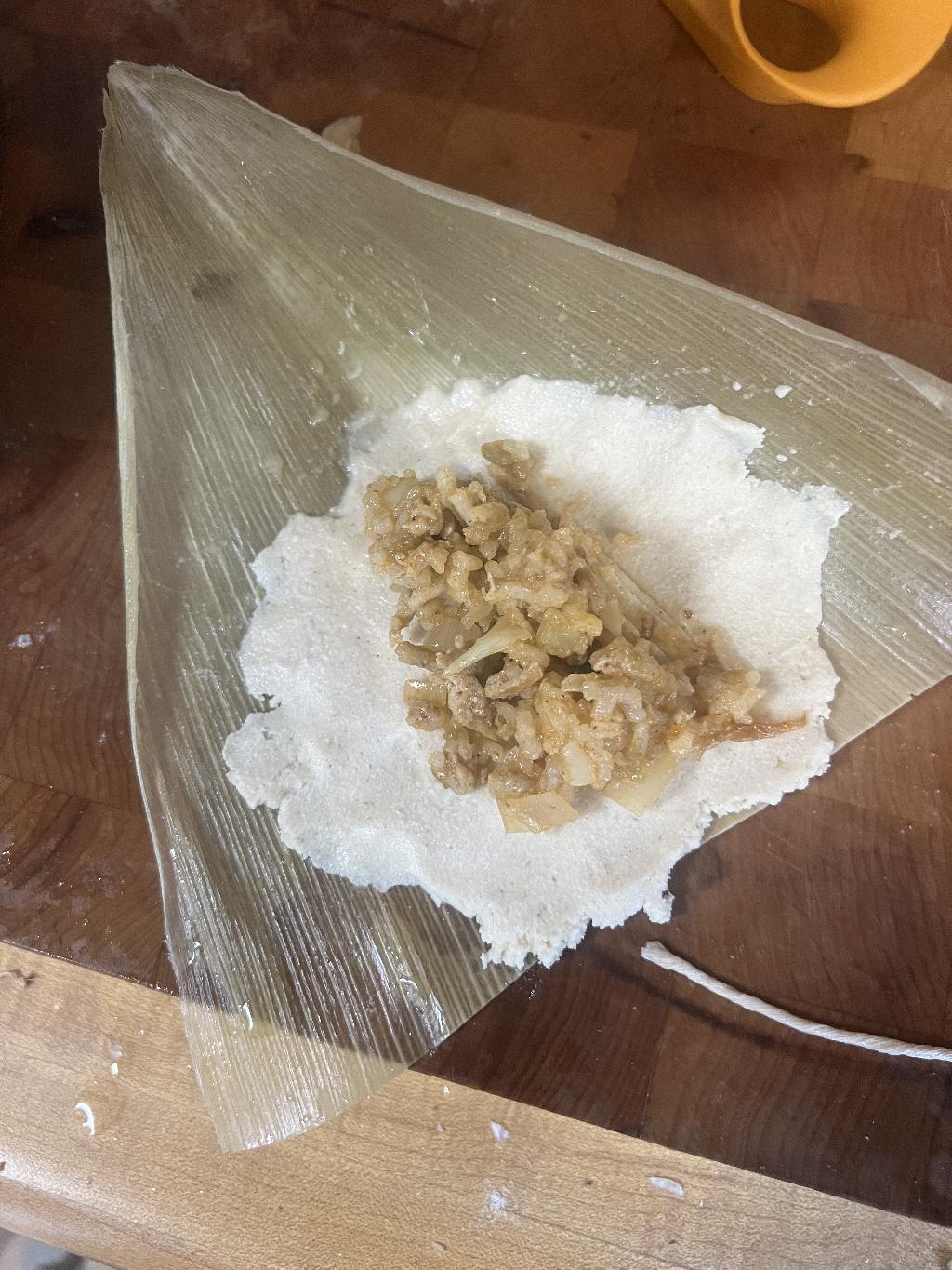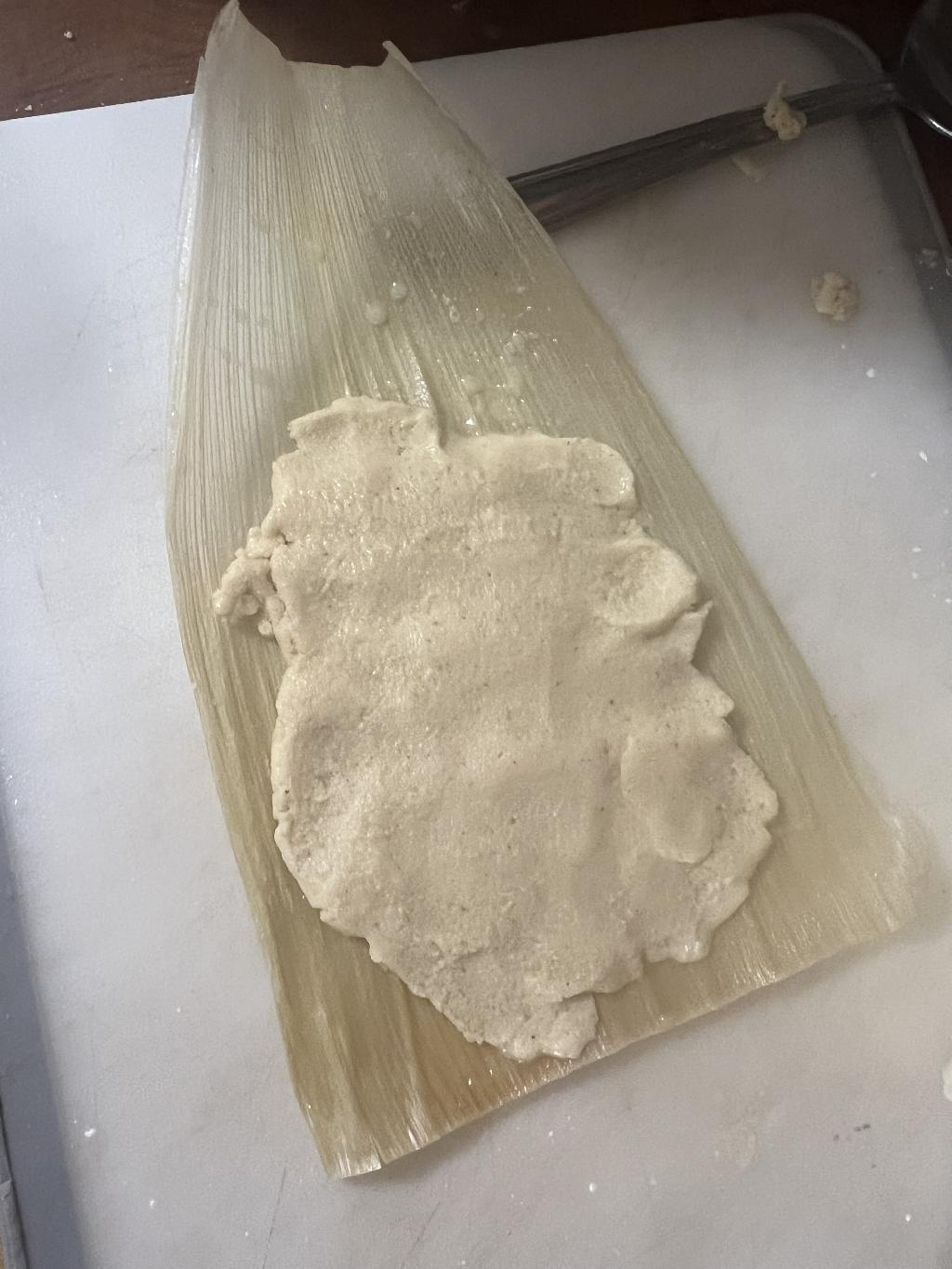 Step #8 Take wet corn husk and lay on counter, with inside of hush facing up. Added in a large spoonful of dough mixture to the center top portion of the hush. Wet your hands to prevent dough from sticking then press down on the dought with fingers and palm spreading and flatten then dough until you have a uniform thin layer. Leave room at the bottom of the husk to allow for rolling.