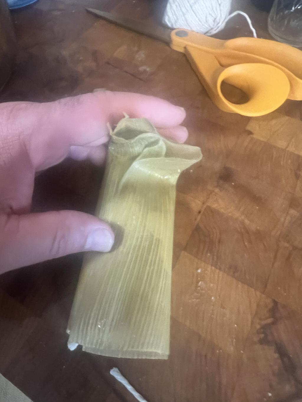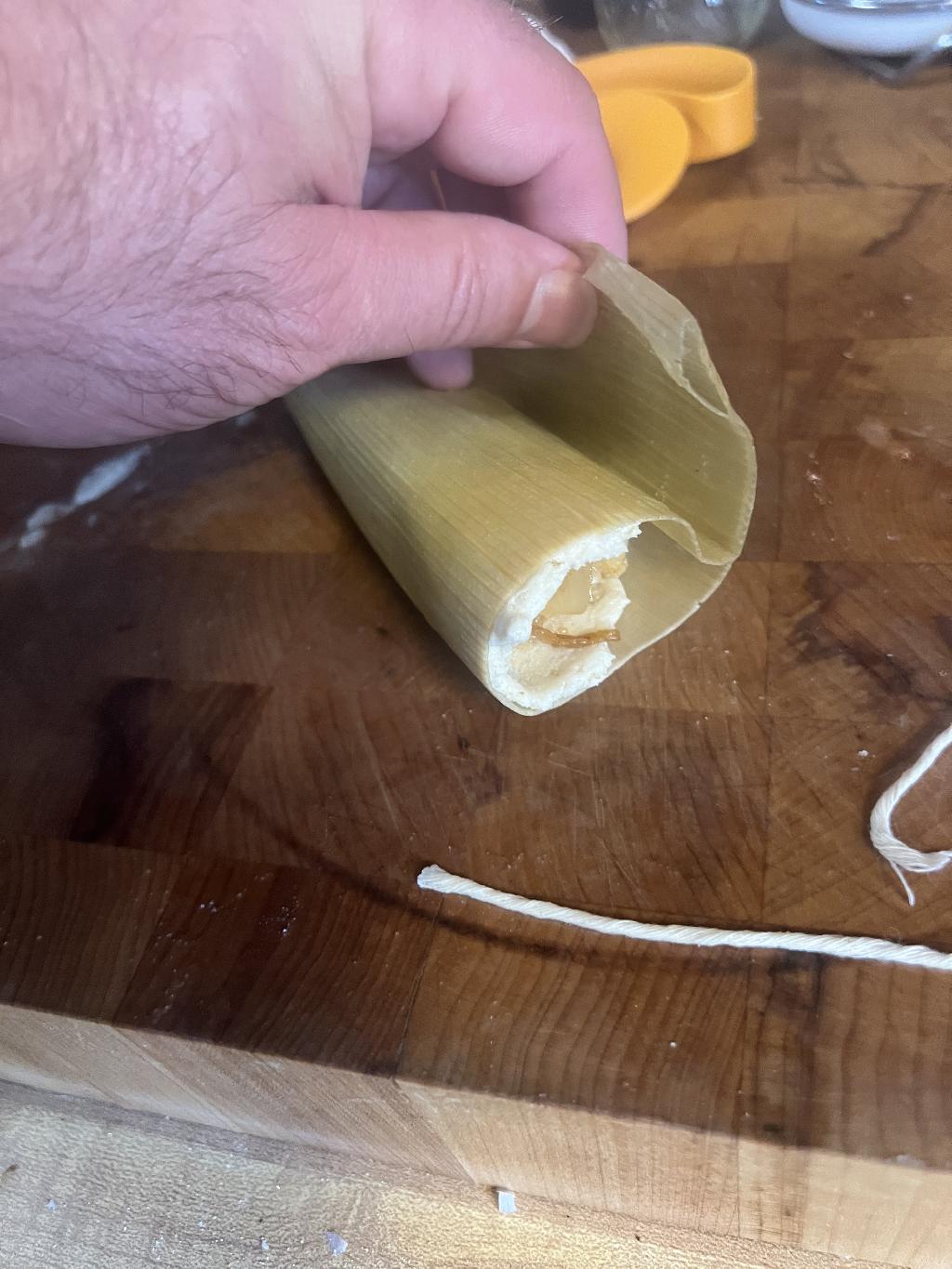 Step #13 Now take of the bottom of the corn husk and fold it towards the top.