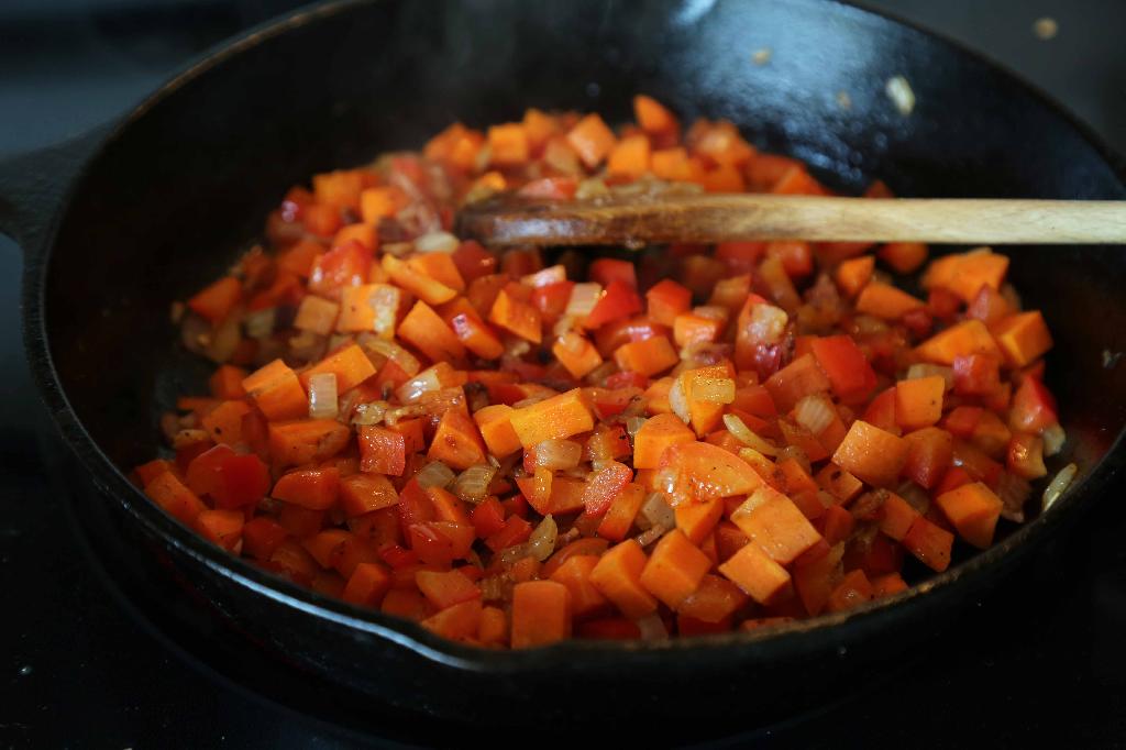 Step #2 Meanwhile, add chopped bacon to a large skillet over medium heat to render. Then add diced onion with a pinch of salt and sauté until translucent. Next, add diced red bell pepper, diced carrot and another pinch of salt, and sauté until soft, stirring occasionally. Add minced garlic and stir for 30 seconds. Take off heat.