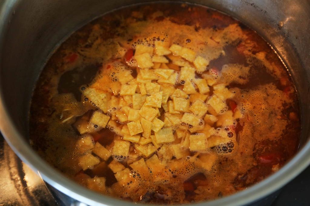 Step #3 After 1 hour and 30 minutes, take pheasant pieces out of the pot and shred the meat. Return shredded meat and bones to the pot. Add the cooked vegetables, chili powder, paprika, cayenne pepper, lime juice and diced corn tortillas to the soup. Add 1½ teaspoons of Knorr chicken flavor bouillon. Cover and simmer for 1 hour, stirring occasionally. Add more water if the soup reduces too much.
